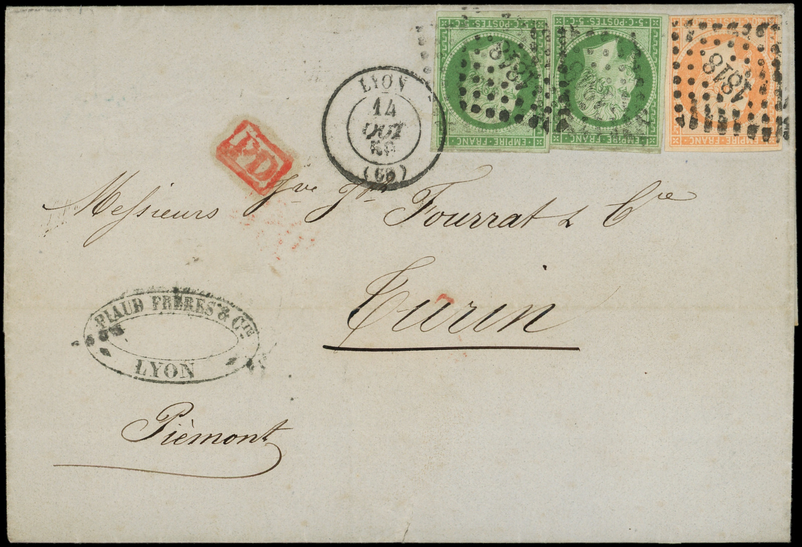et 40c. obl. PC 1818 s. LAC, càd T15 Lyon 14/10/59, arr. TORINO 16/10, combinaison TTB (Image) (Image2)