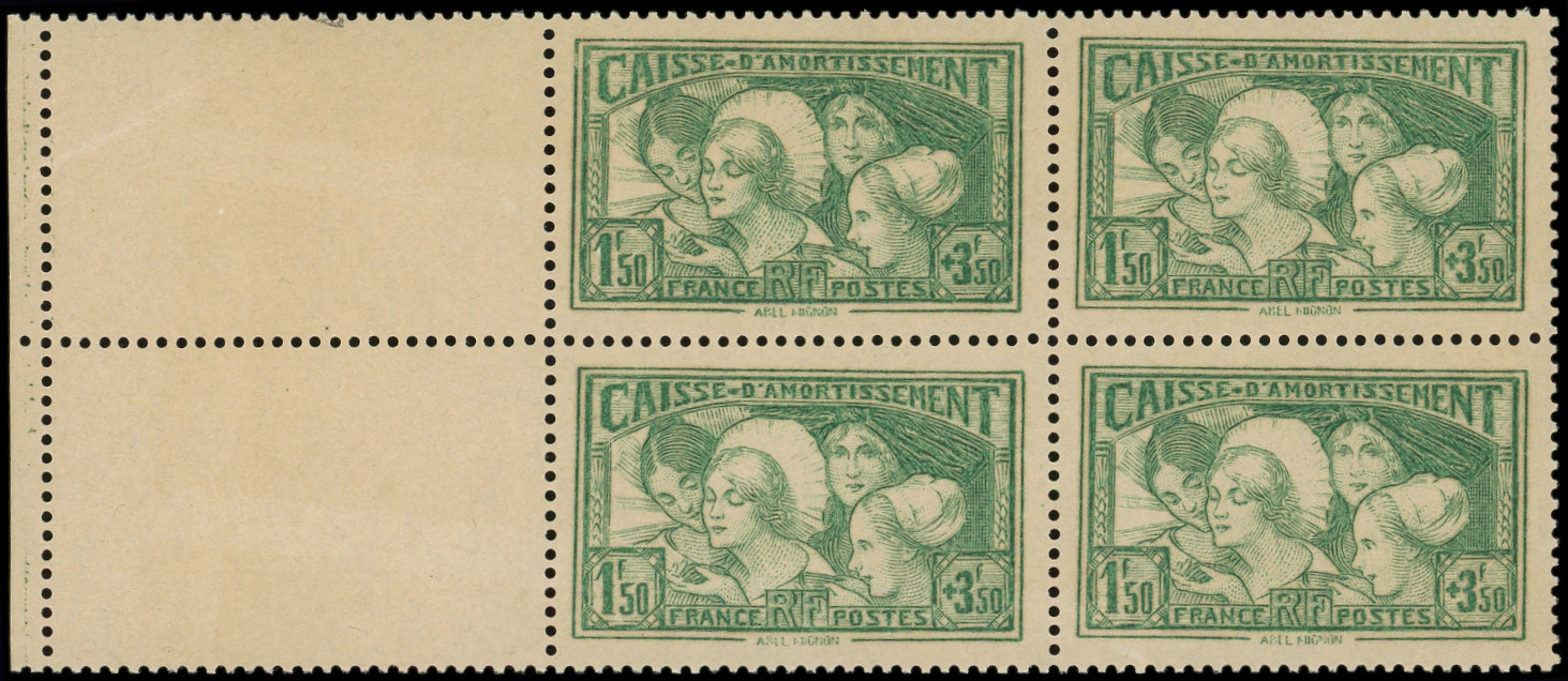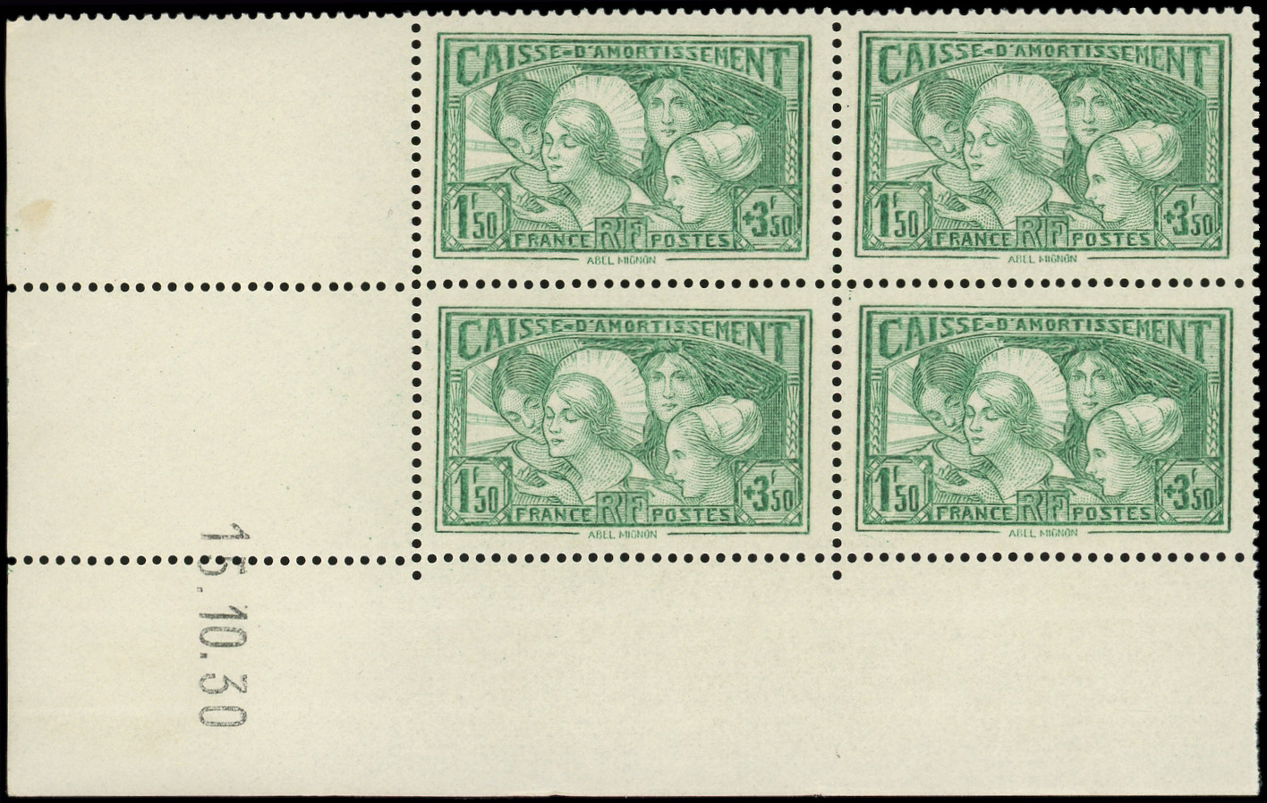 Françaises, 1f.50 + 3f.50 vert jaune, BLOC de 4 CD 15/10/30, ch. s. le bord, TB (Image)