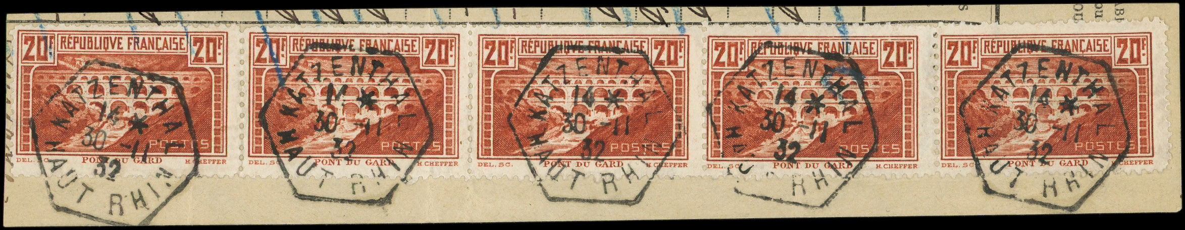 Gard, 20f. chaudron clair, T I, dent. 11, BANDE de 5 obl. Hexag. KATZENTHAL 30/11/32 s. fragt, TB (Image)