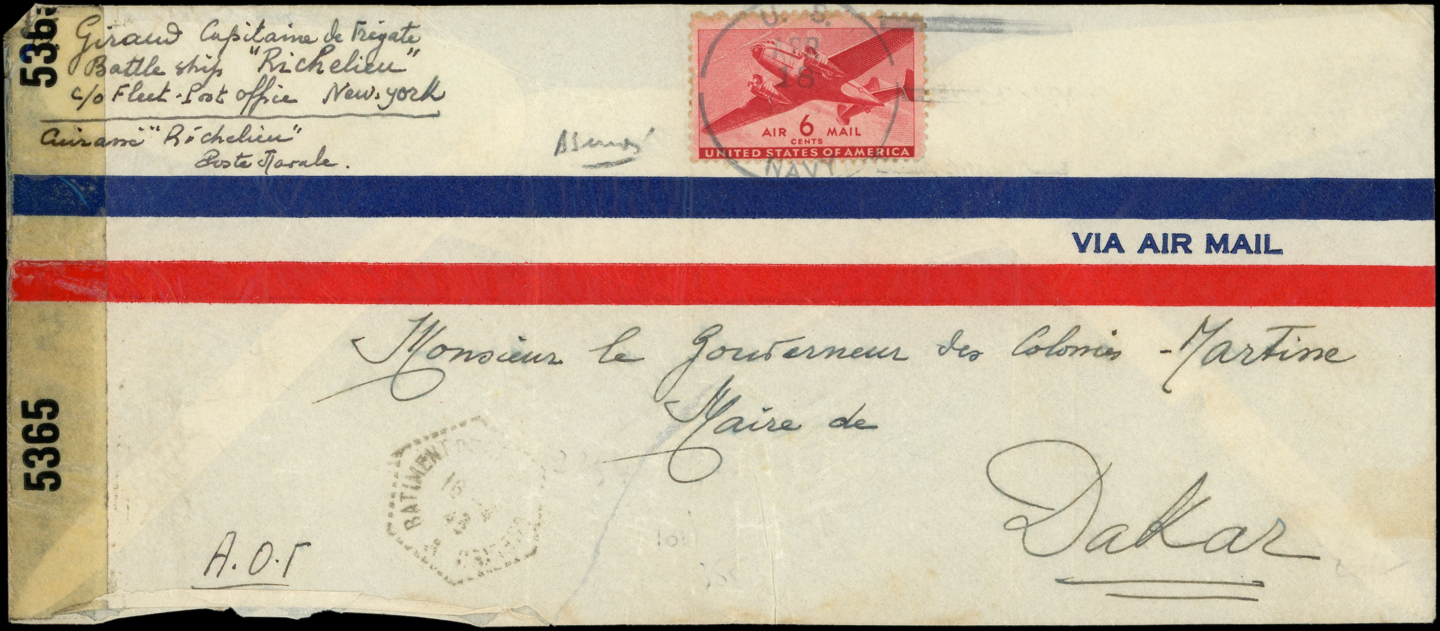 obl. càd US NAVY 18/4/(43) sur Env. Par Avion avec censure, càd Hexag. BATIMENT de LIGNE RICHELIEU 16/4/43, TB (Image) (Image2)