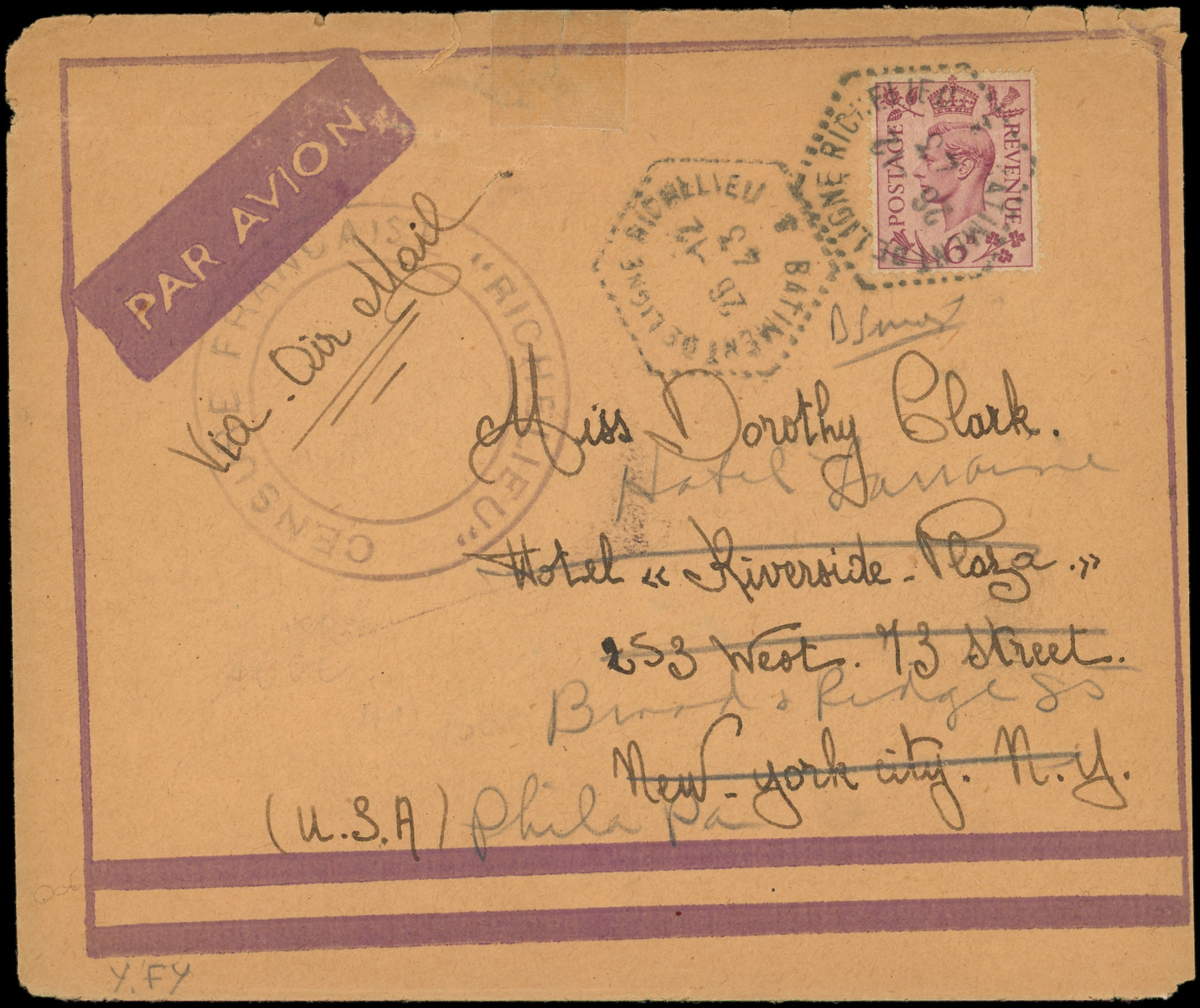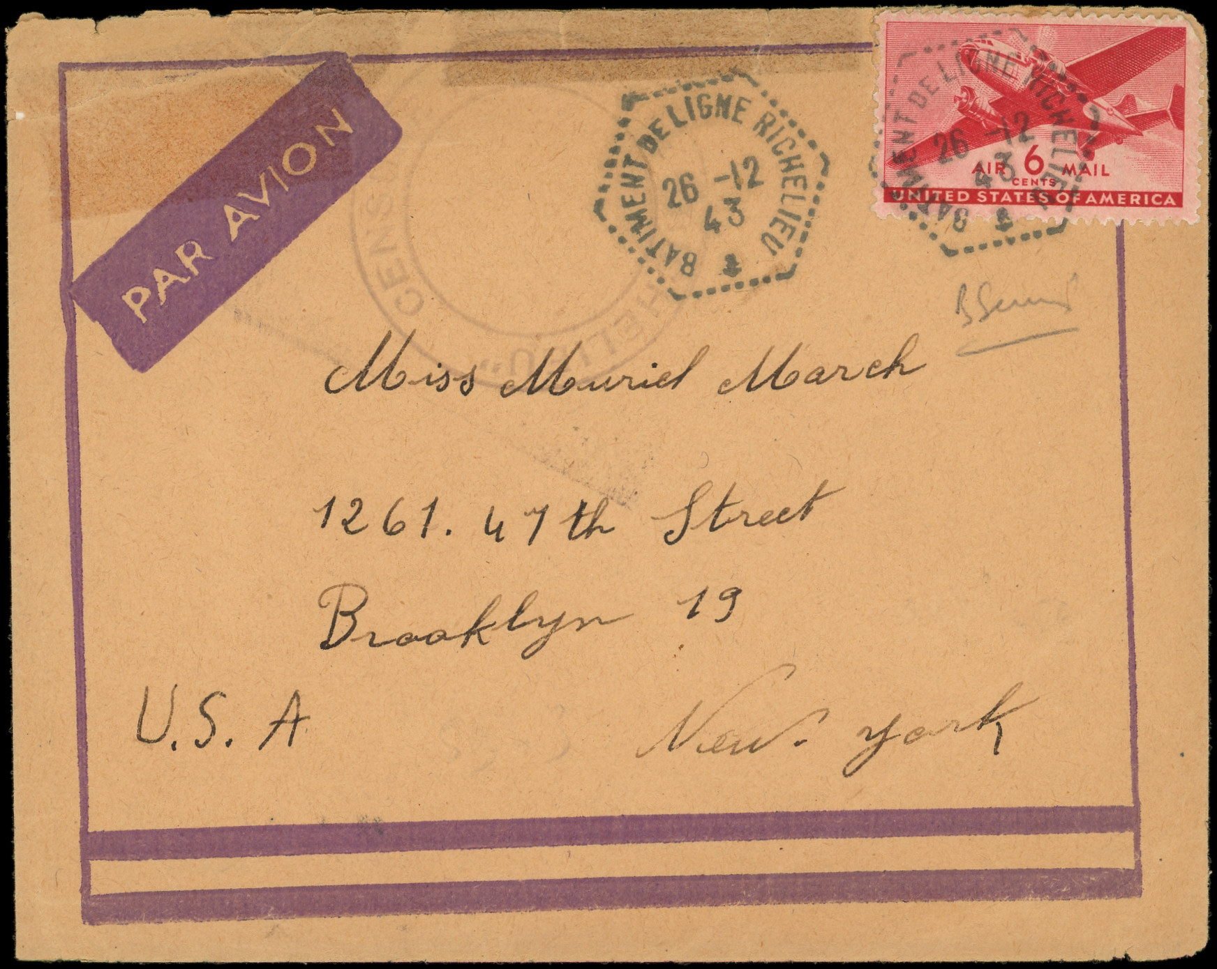 Etats-Unis obl. càd Hexag. BATIMENT DE LIGNE RICHELIEU 7/5/43 sur Env., griffe Richelieu sur 2 lignes, cachet de censure "Richelieu", TB (Image)