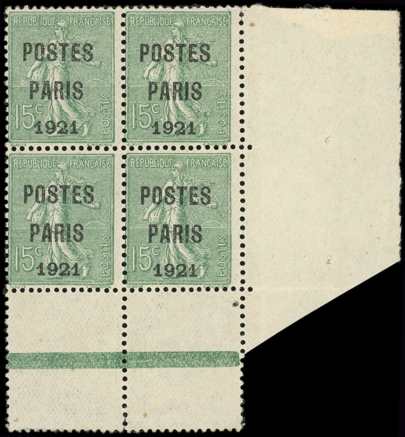 vert-olive, POSTES PARIS 1921, BLOC de 4 cdf (non complet), RR et TTB. Br (Image)