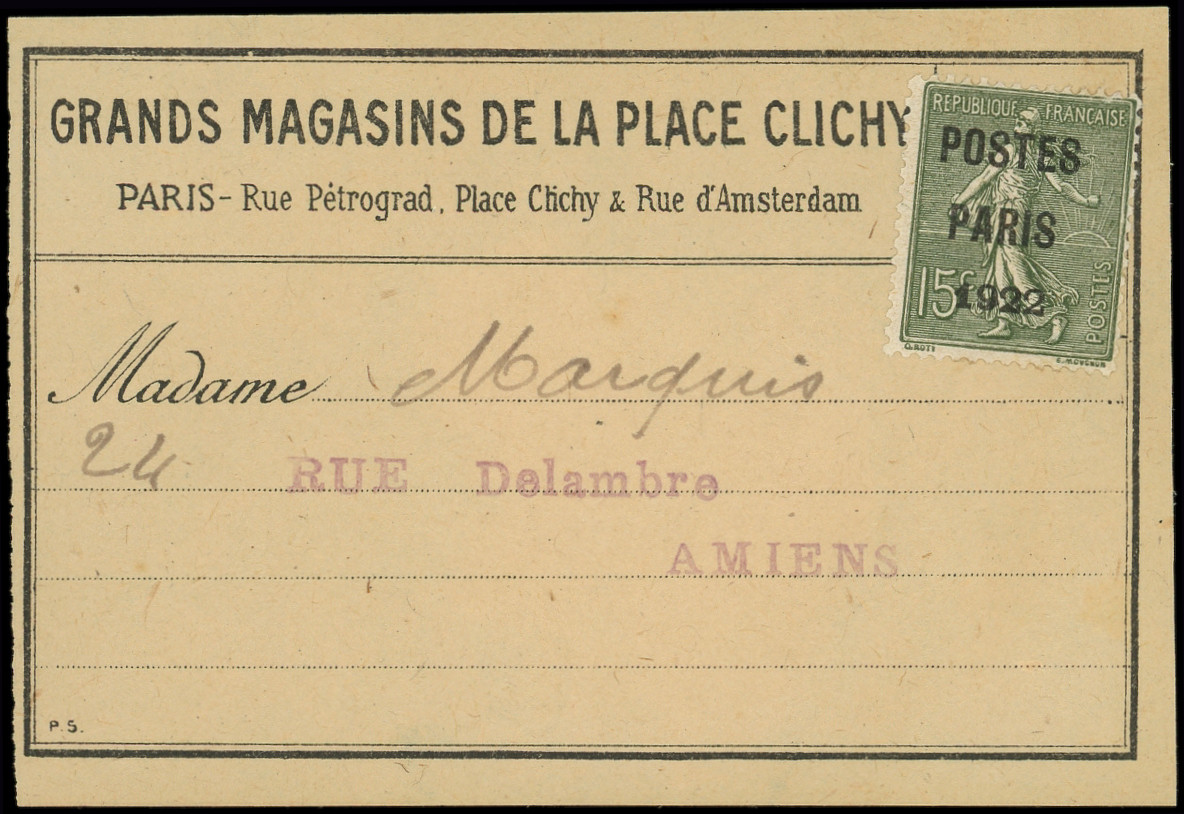 vert-olive, POSTES PARIS 1922, sur étiquette des GRANDS MAGASINS DE LA PLACE CLICHY, TB (Image)