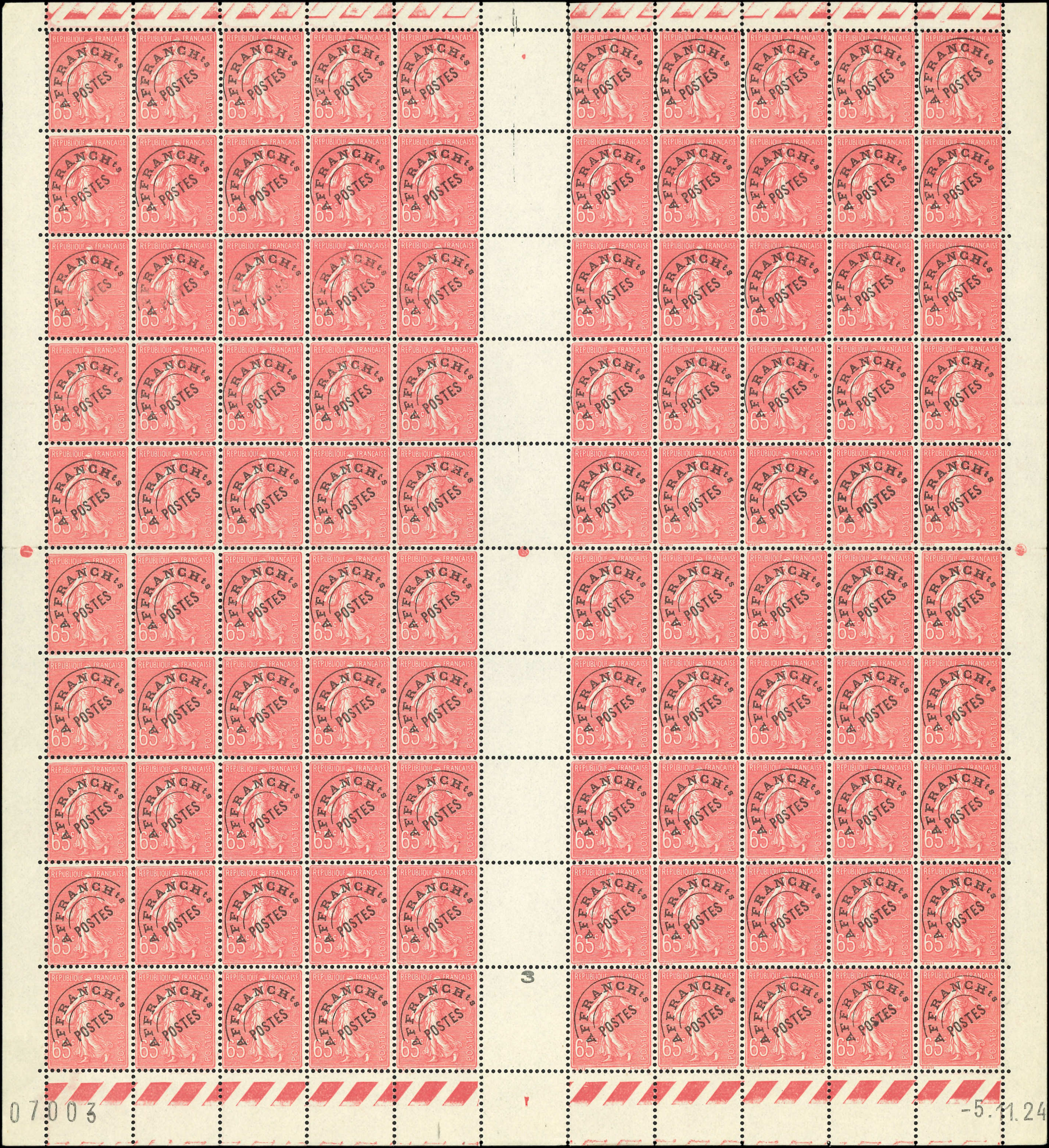 Lignée, 65c. rose, FEUILLE de 100, CD 5/11/24, TB (Image)