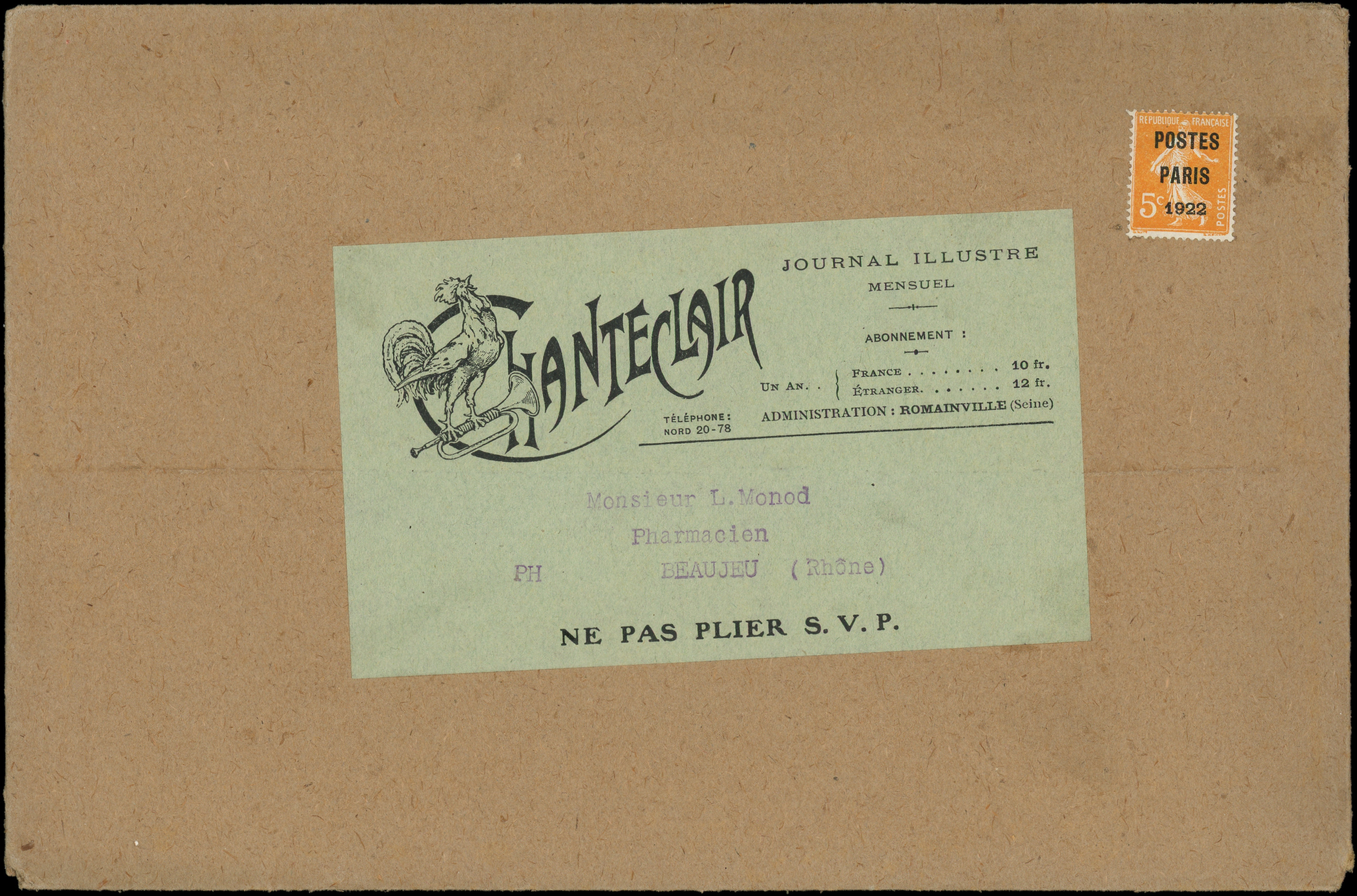 POSTES FRANCE 1921 sur Env. commerciale, Journal illustré CHANTECLAIR, TB (Image)