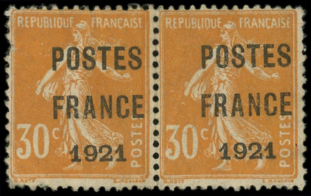 POSTES FRANCE 1921, PAIRE, 1 ex. défectueux, RARE ainsi, TB (Image)