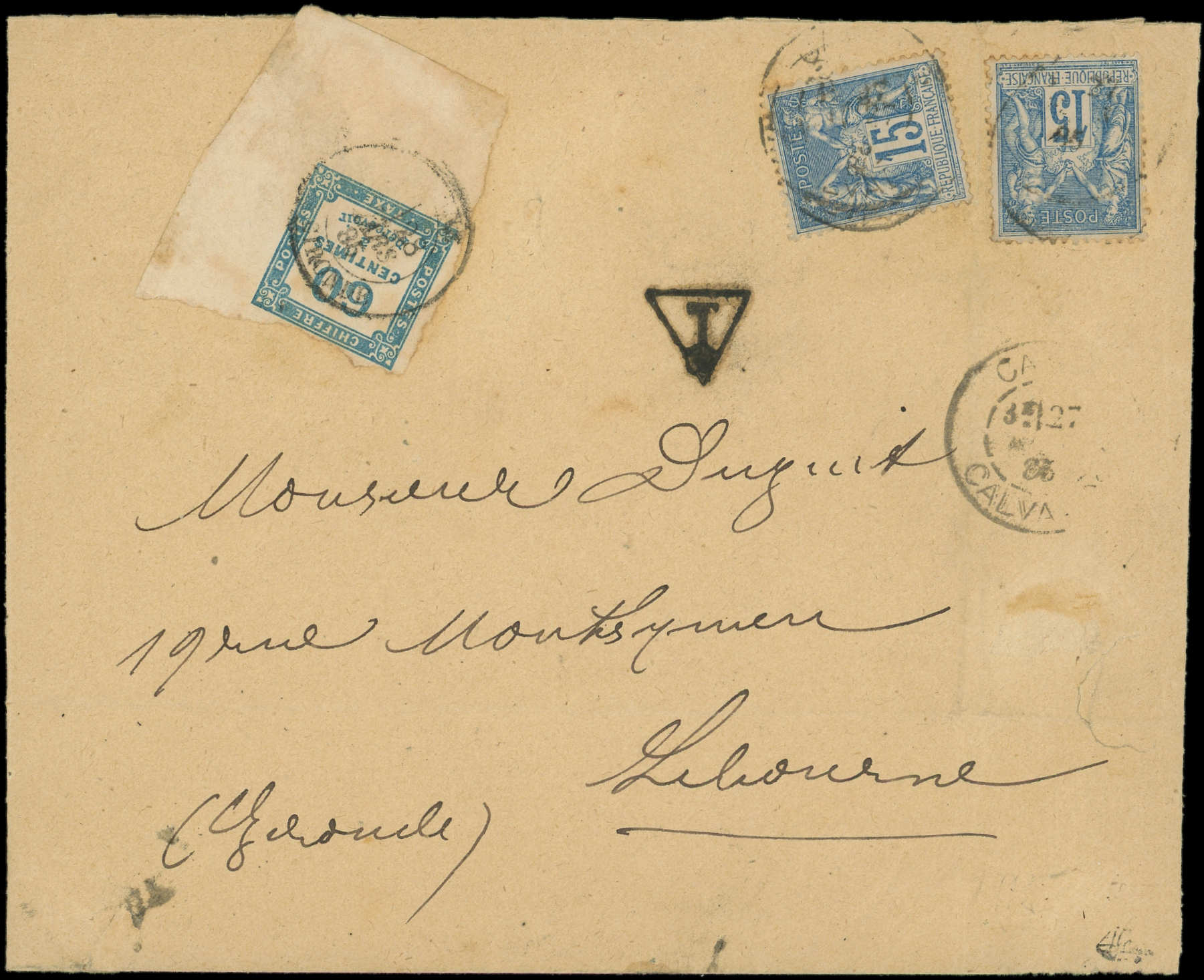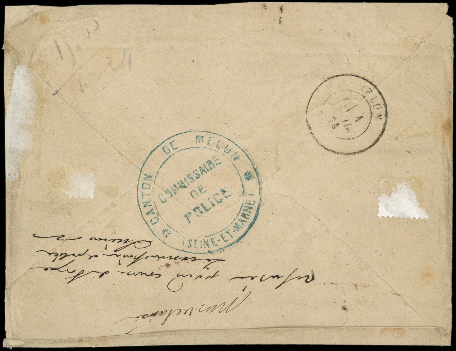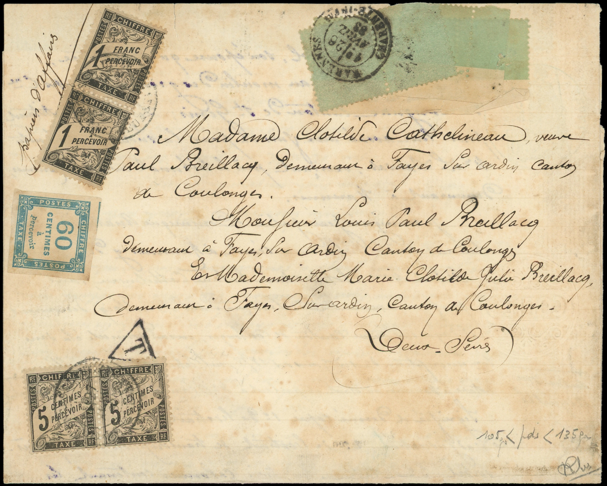 bleu, 5c. et 1f. noir en PAIRES, taxation à 2f70 s. envoi de docs par un huissier de MARENNES (poids 105 à 135 g.), taxation à COULONGES Deux Sèvres, RR, TB. C (Image)