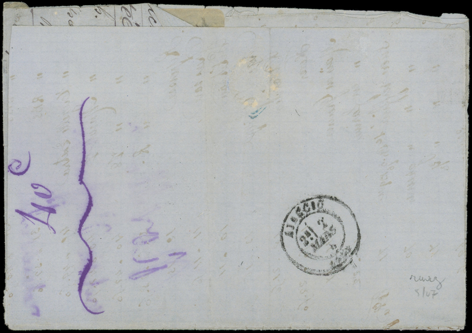 pli d'archive, obl. càd ALGER 28/7/73 s. LSC de BOUGIE, càd BAT. A VAP BONE ALGER 26/7, R et TB (Image)