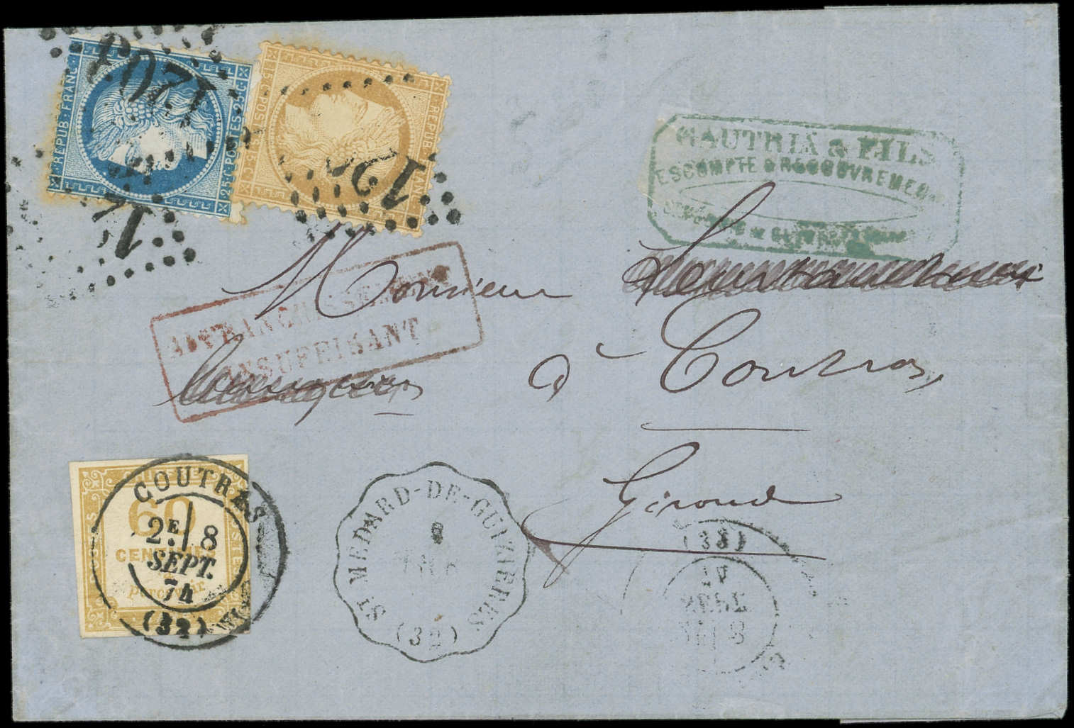 obl. càd T17 COUTRAS 8/9/74 s. LAC de St MEDARD de GUIZIERES (cachet Convoyeur) affr. N°59 et 60 obl. GC 1203, poids entre 50 et 100g., taxation 1fr. moins 40c., RR et TTB