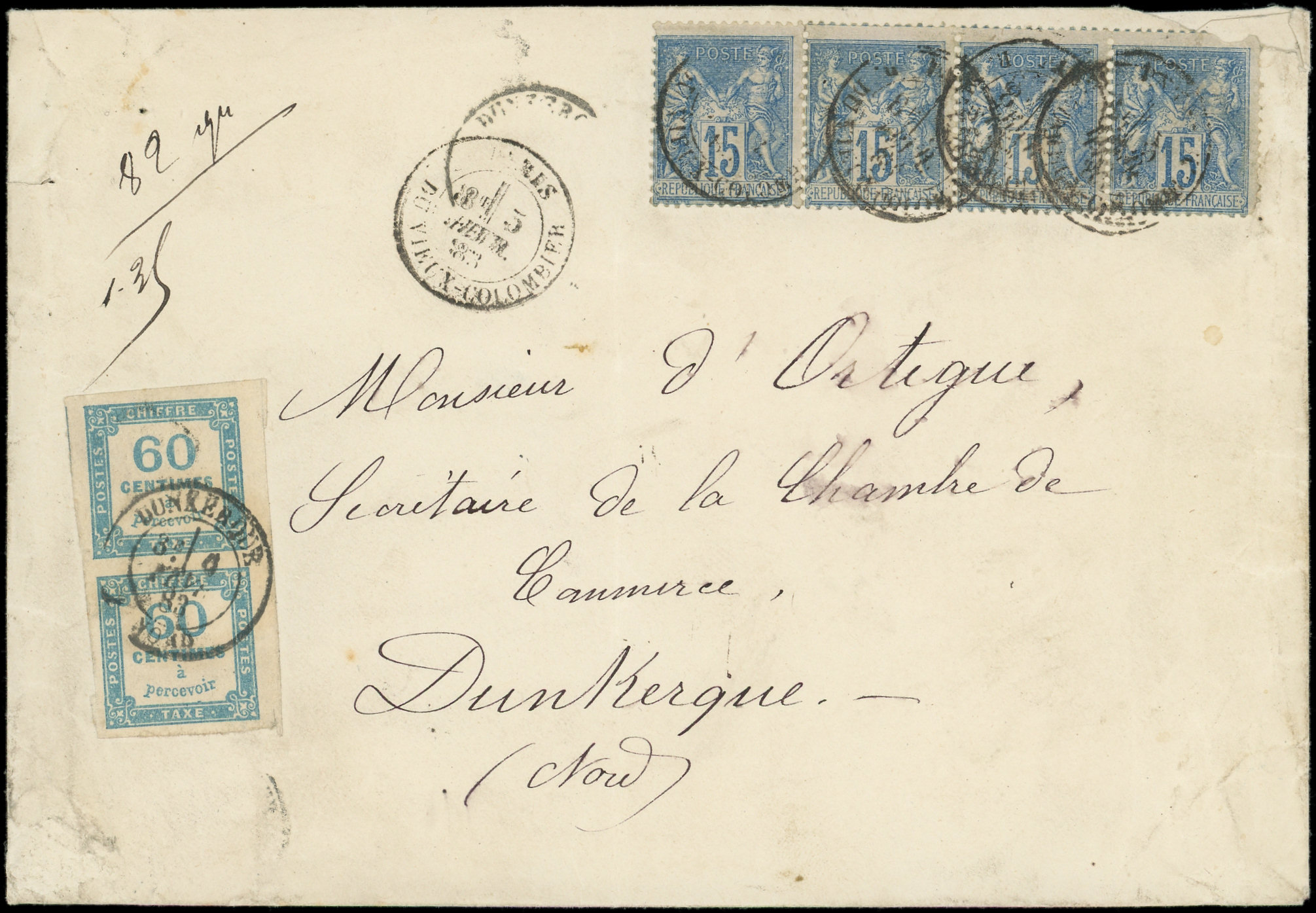 PAIRE obl. càd T17 DUNKERQUE 6/2/83 s. Env. pesant 82g. affr. 15c. Sage (4) obl. PARIS VIEUX COLOMBIER 5/2, Taxe 1f80 - 60c., RR, TB (Image)