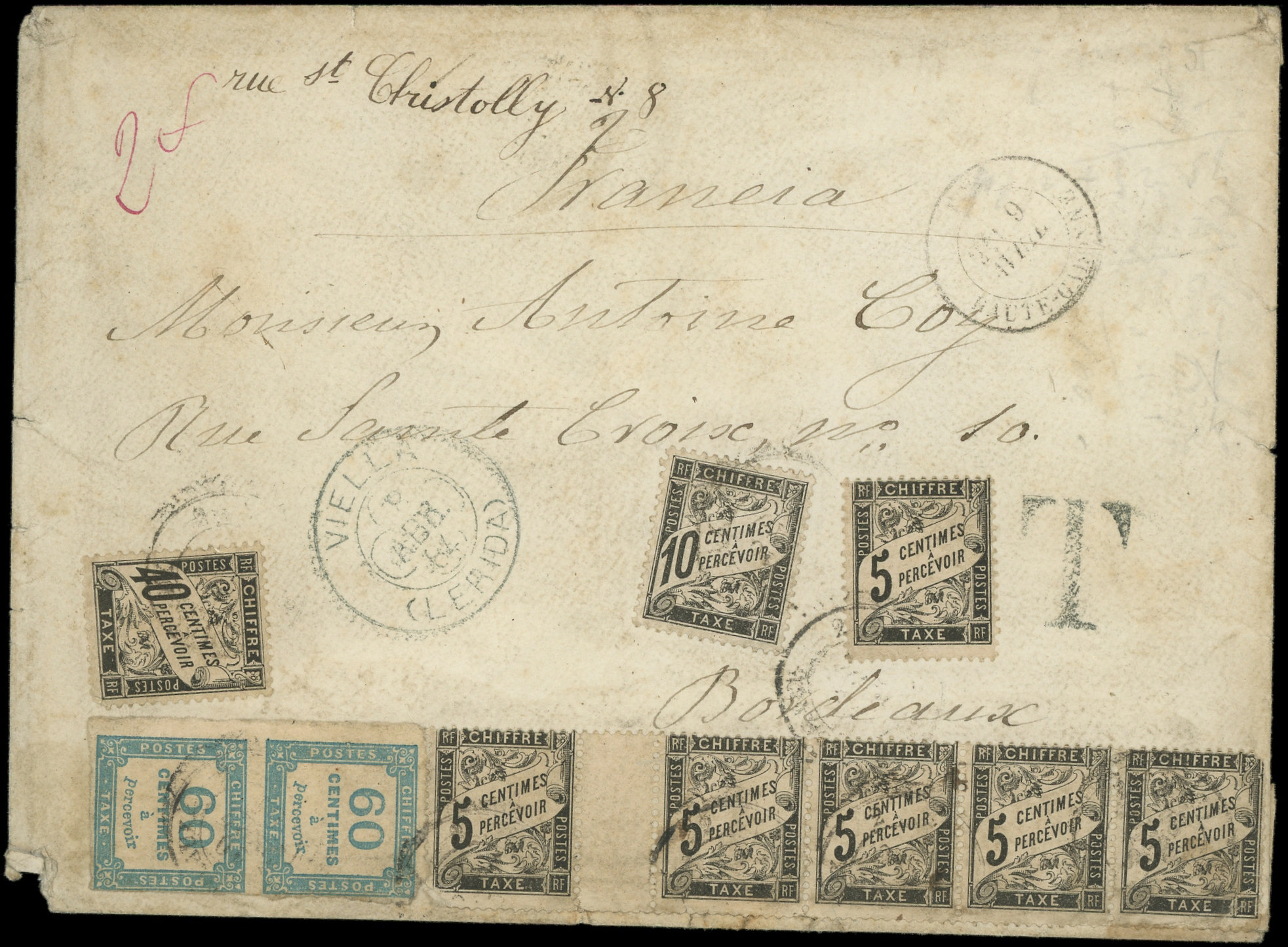 60c. bleu PAIRE, 5c. noir BANDE de 5 + 1 ex., 10c. et 40c. noir, obl. s. Env. de VIELLA ESPAGNE 8/4/84, RR, TB, certif. JF Brun (Image)