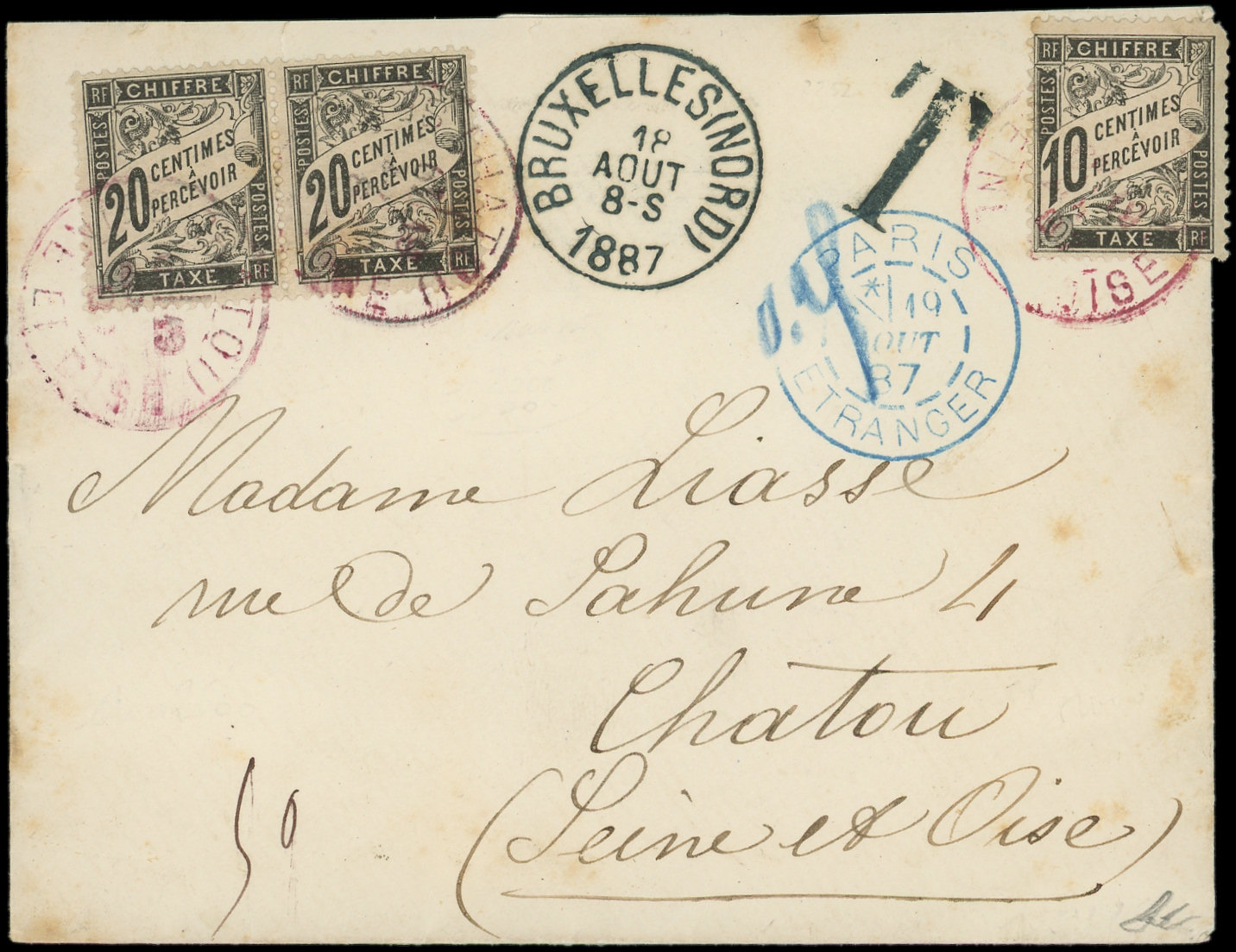 noir et 20c. noir PAIRE obl. càd ROUGE CHATOU 19/8/87 s. Env. de BRUXELLES 18/8 non affr., TTB (Image) (Image2)