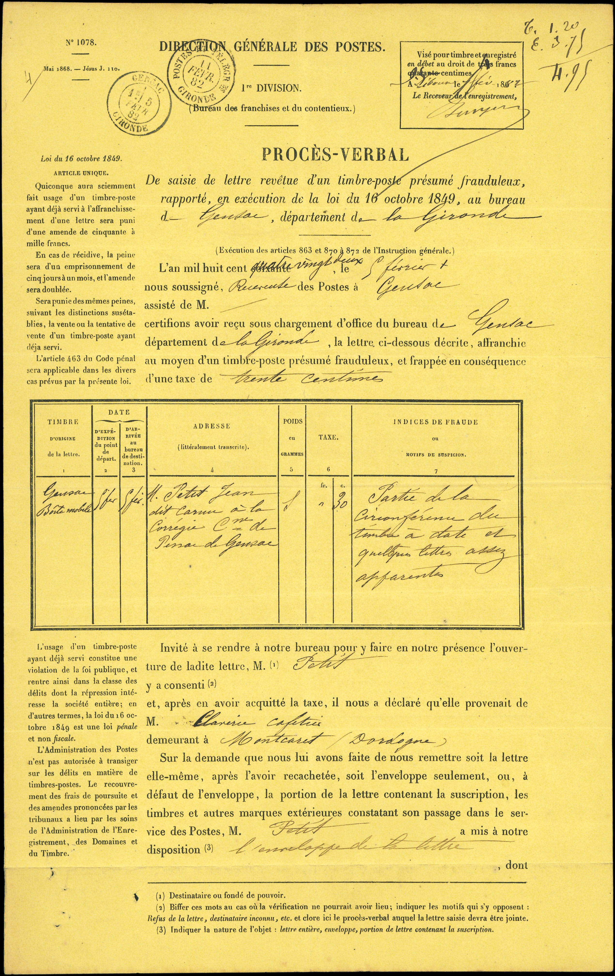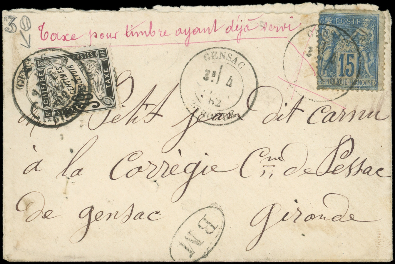 obl. GENSAC 4/2/82 s. Env. affr. N°90, mention Taxe pour timbre ayant déjà servi, cachet BM et Procès verbal, TB (Image) (Image2)