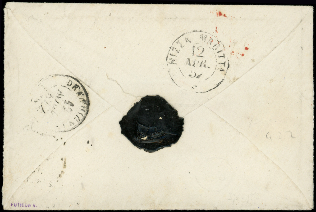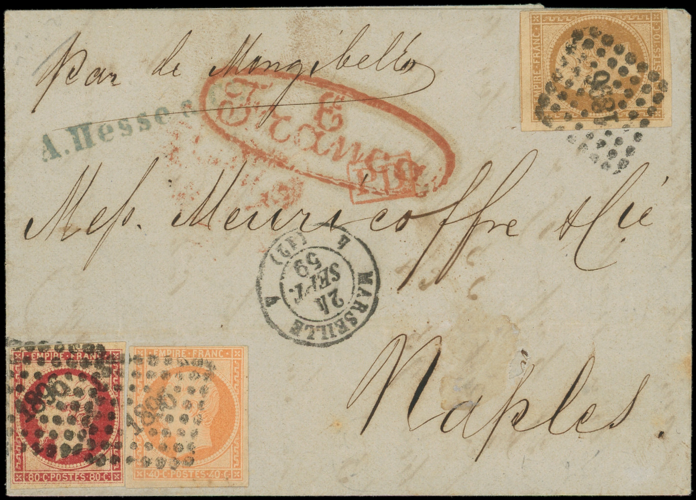 10c., 40c. et 80c. obl. PC 1896 s. LAC, càd MARSEILLE 24/9/59, arr. NAPOLI 27/9, TRICOLORE TTB (Image)