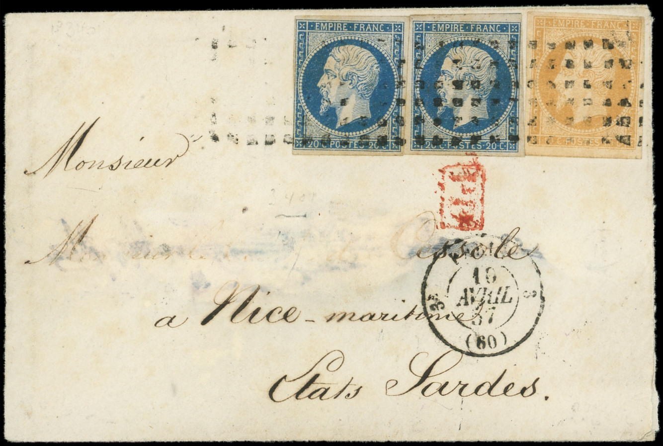 citron, impr. déf. et 20c. bleu foncé (2) obl. GROS POINTS s. Env., càd 3e PARIS 3 10/4/57, arr. NIZZA MARITTa, TB (Image) (Image2)