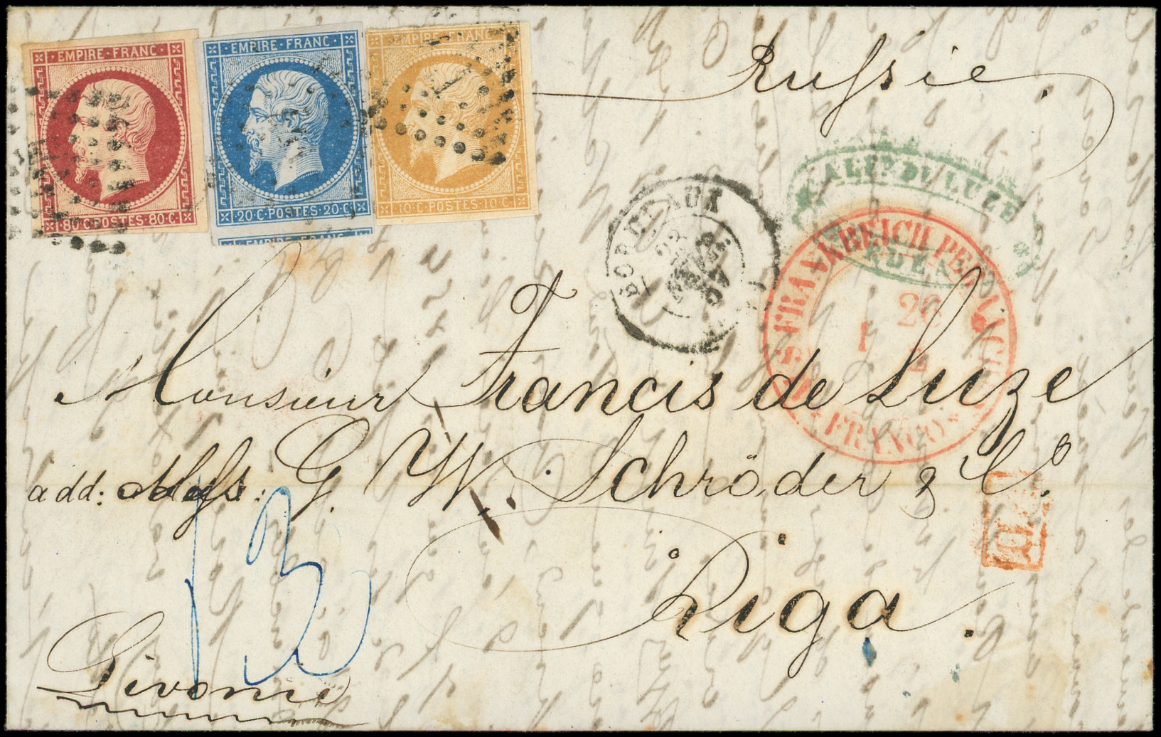 10c., 20c. et 80c. obl. PC 441 s. LAC, càd Bordeaux 23/2/57, arr. RIGA 17/2 julien, TRICOLORE TB (Image) (Image2)