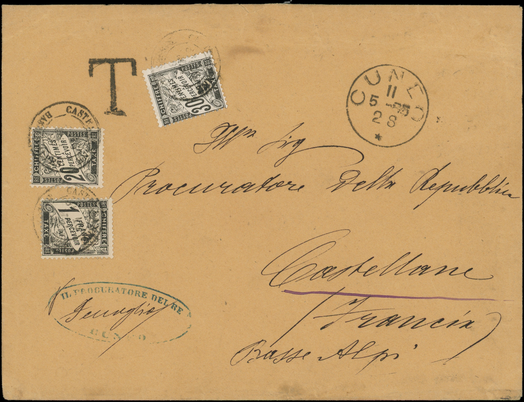 N°17 et 18, 20c. et 30c. noir, obl. càd CASTELLANE 16/5/85 s. Env. non affr. du Tribunal de CUNEO, càd 11/5, RR et TB (Image) (Image2)
