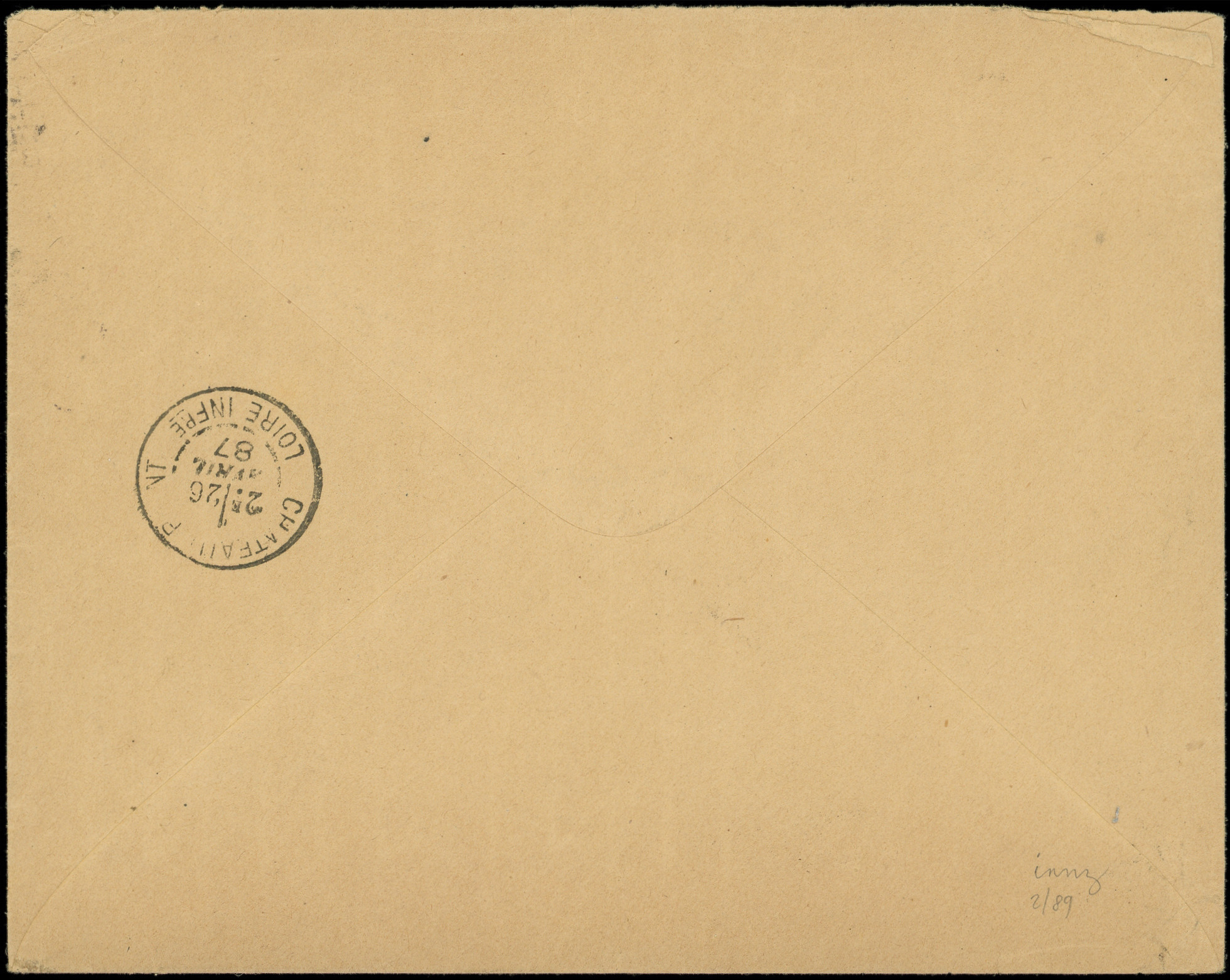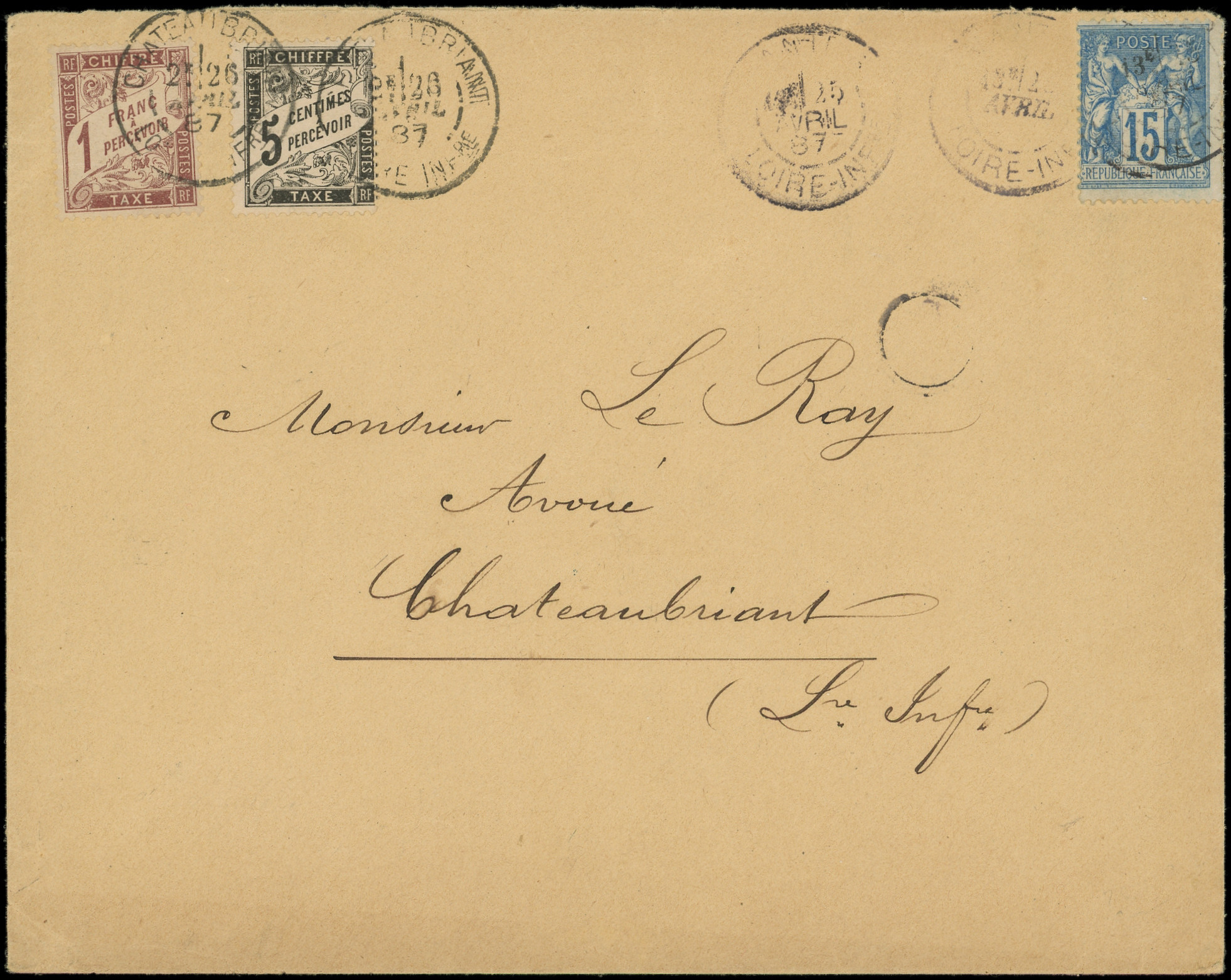 et N°14 5c. noir obl. càd CHATEAUBRIANT 28/4/87 s. Env. affr. N°90 15c. bleu obl. càd NANTES 25/4, TB (Image) (Image2)