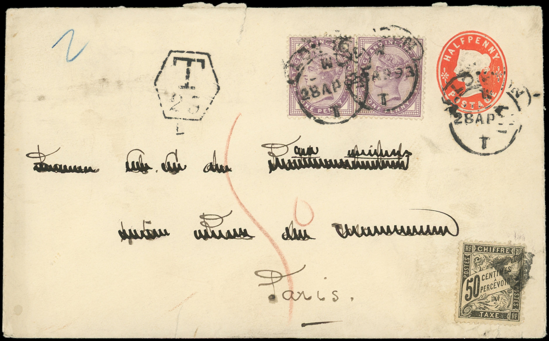 obl. Triangle à Paris s. Env. Entier Half p. + PAIRE 1p. de GRANDE BRETAGNE, 1893, TB (Image) (Image2)