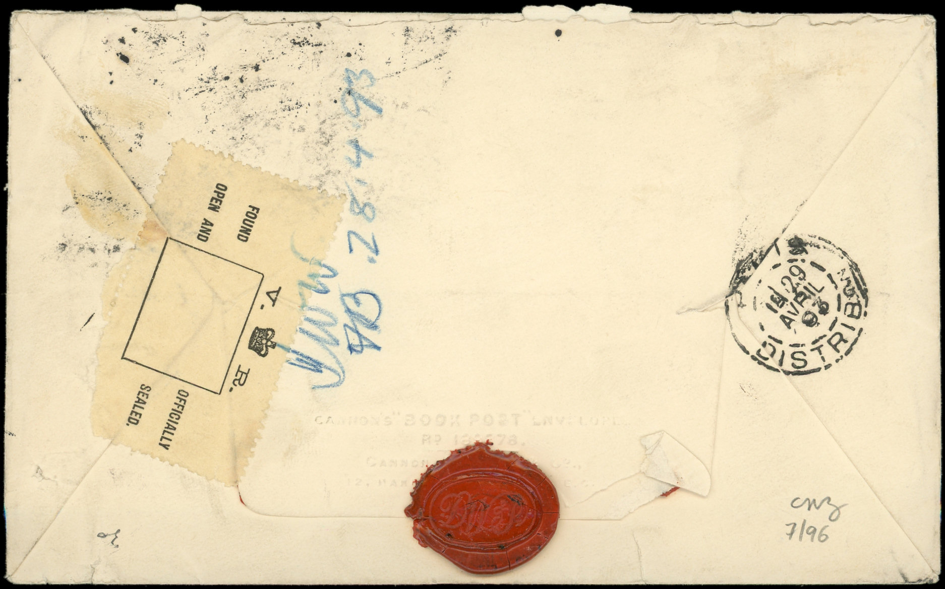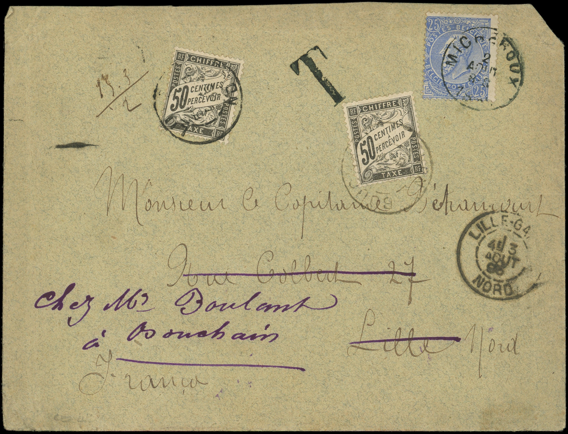 obl. LILLE GARE NORD s. Env. affr. 25c. bleu de Belgique obl. MICHEROUX 2/8/95, réexp. à BOUCHAIN 4/8 d'où l'apposition d'un 2e timbre Taxe à 50c., intéressant et TB