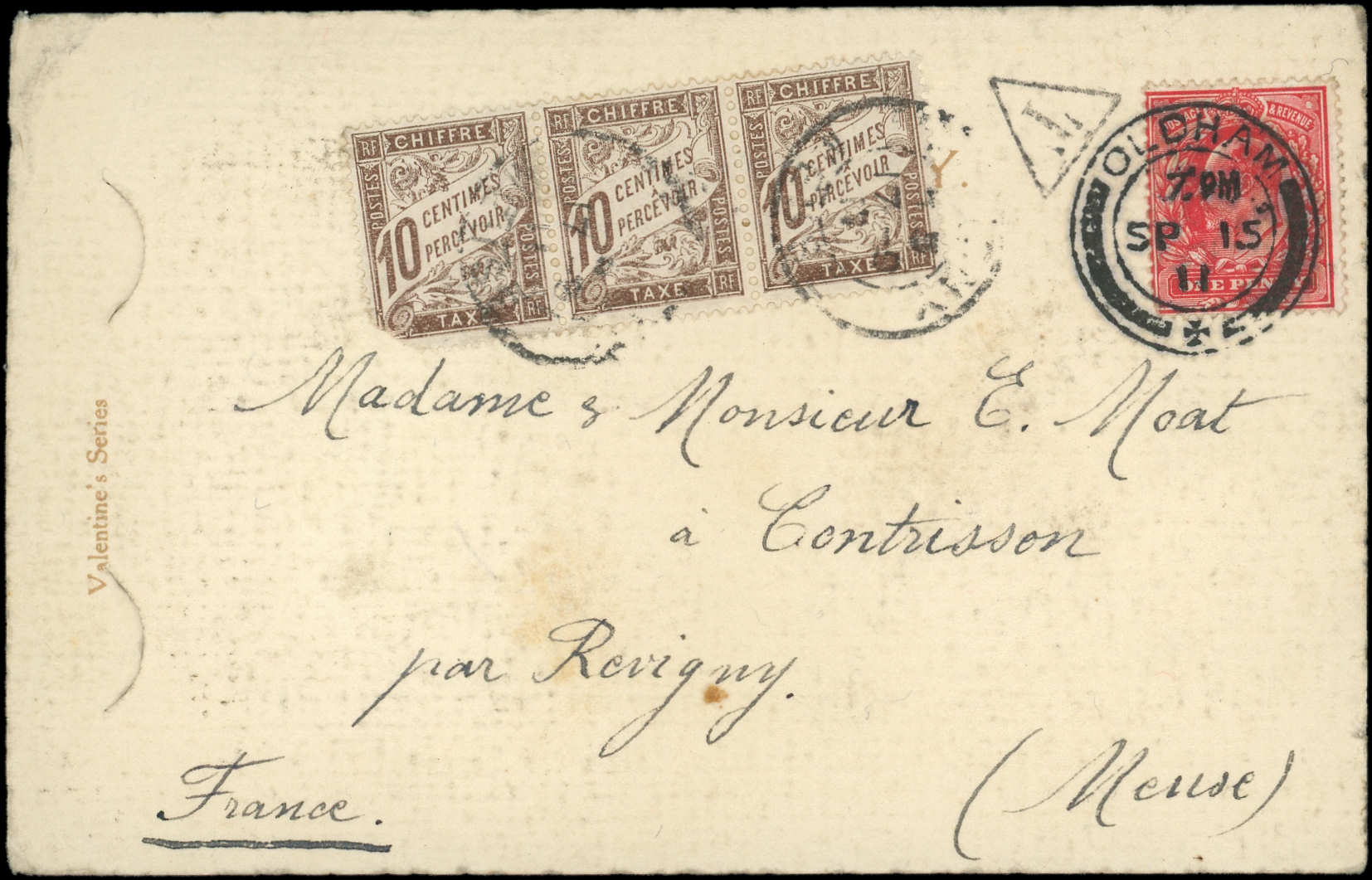obl. REVIGNY 17/9/11 s. CP à montages affr. 1p. de GB, non admise et TAXEE comme lettre, TB (Image)