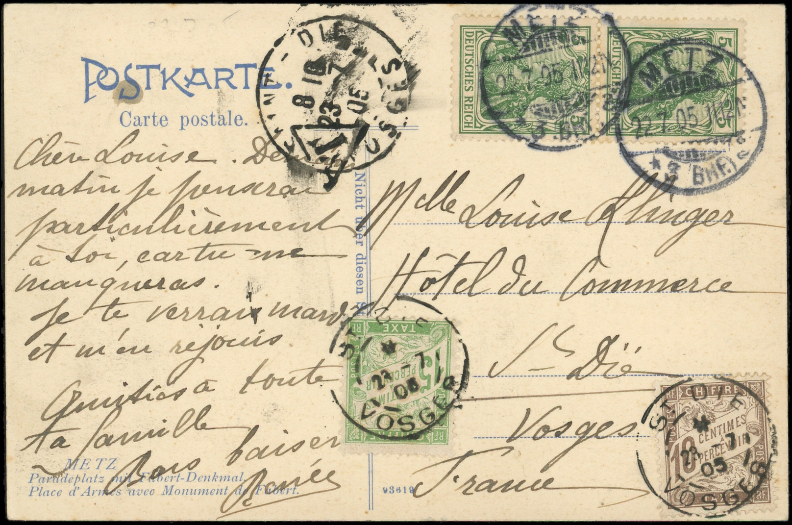 15c. obl. ST DIE 23/7/05 s. CP à recto divisé affr. 5pf. (2) d'ALLEMAGNE obl. METZ 22/7, TB (Image)