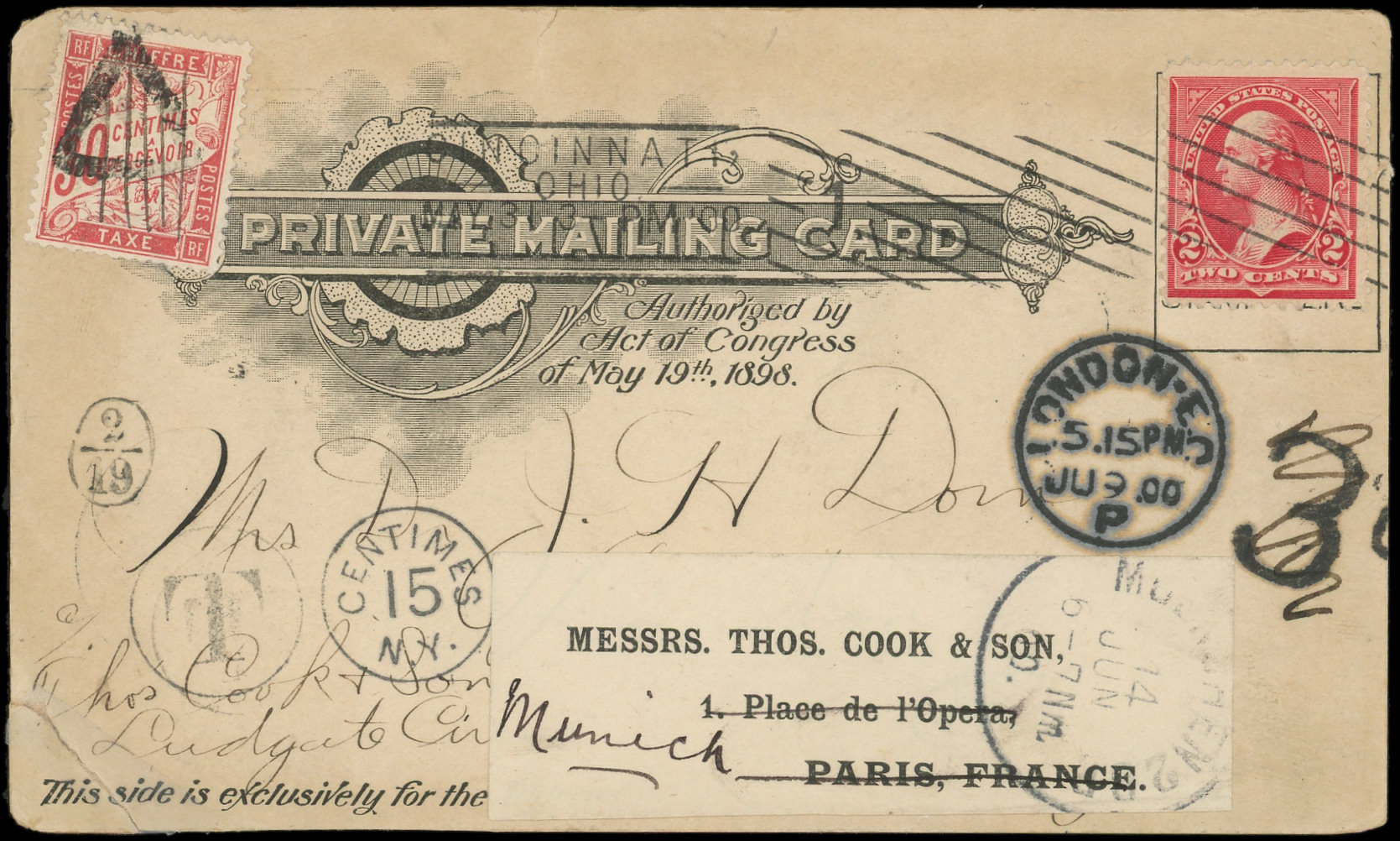 carminé, obl. Triangle à Paris s. CP affr. 2c. des U.S.A. pour GB réexp. en France. CP privée ne portant pas le titre "Carte Postale", TB (Image)