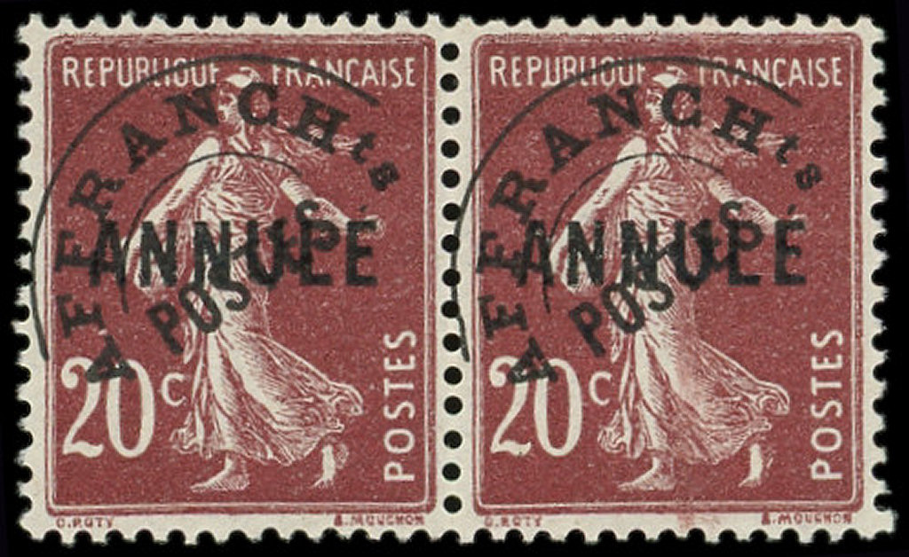 Semeuse Camée, 20c. brun-lilas, PAIRE surch. ANNULE, TB (Image)
