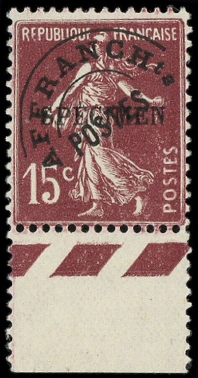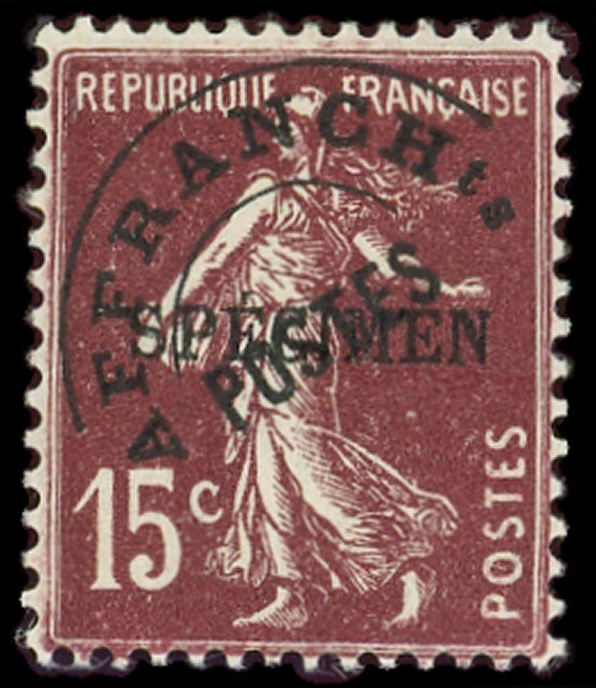 Semeuse Camée, 15c. brun-lilas surch. SPECIMEN sans accent, TB, Maury N°86a (Image)