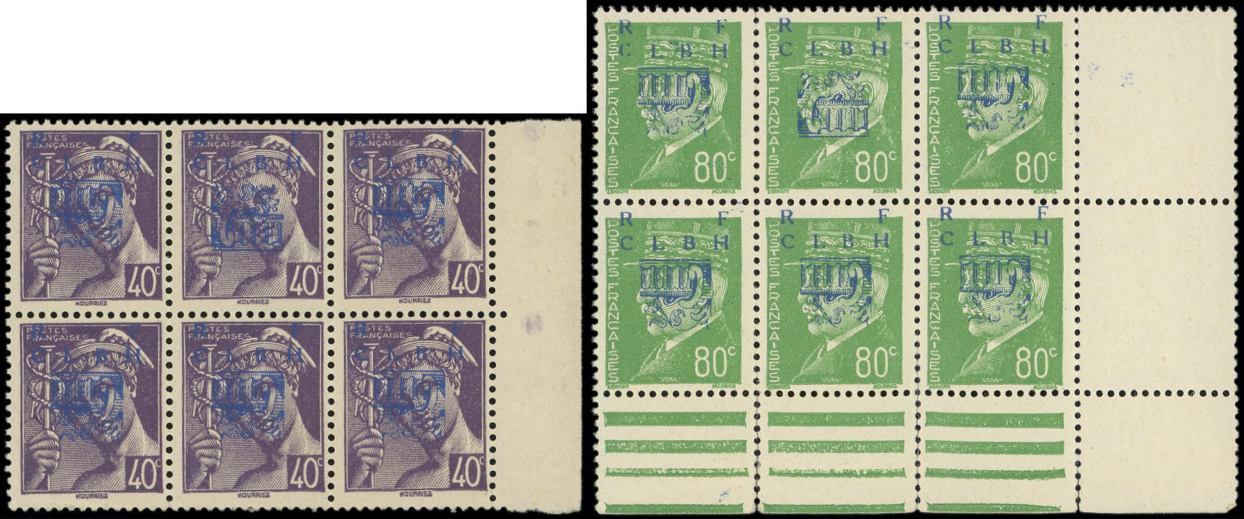 violet et 80c. vert, NON EMIS en BLOCS de 6, 5 ex. T II, 1 ex. T III, bdf ou cdf, R et TB (Image)