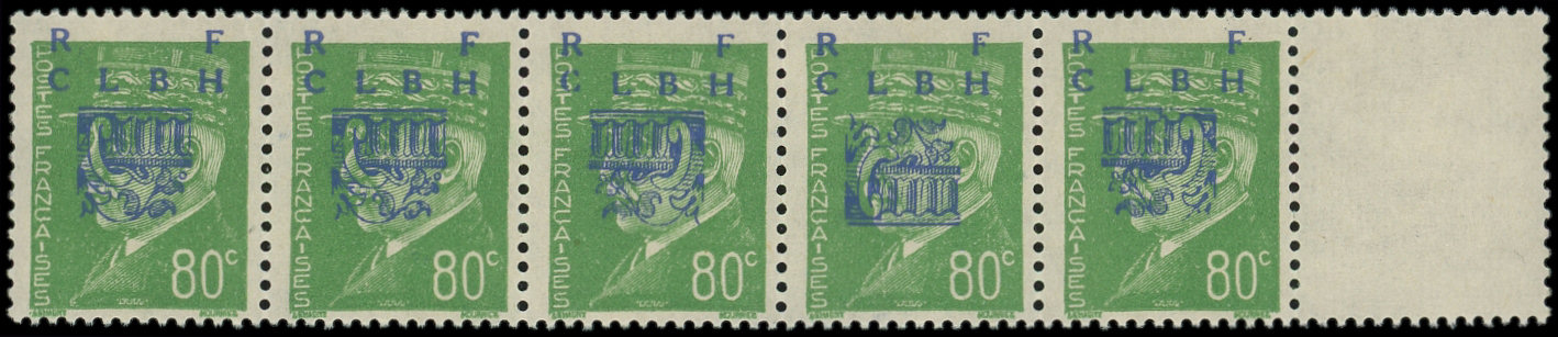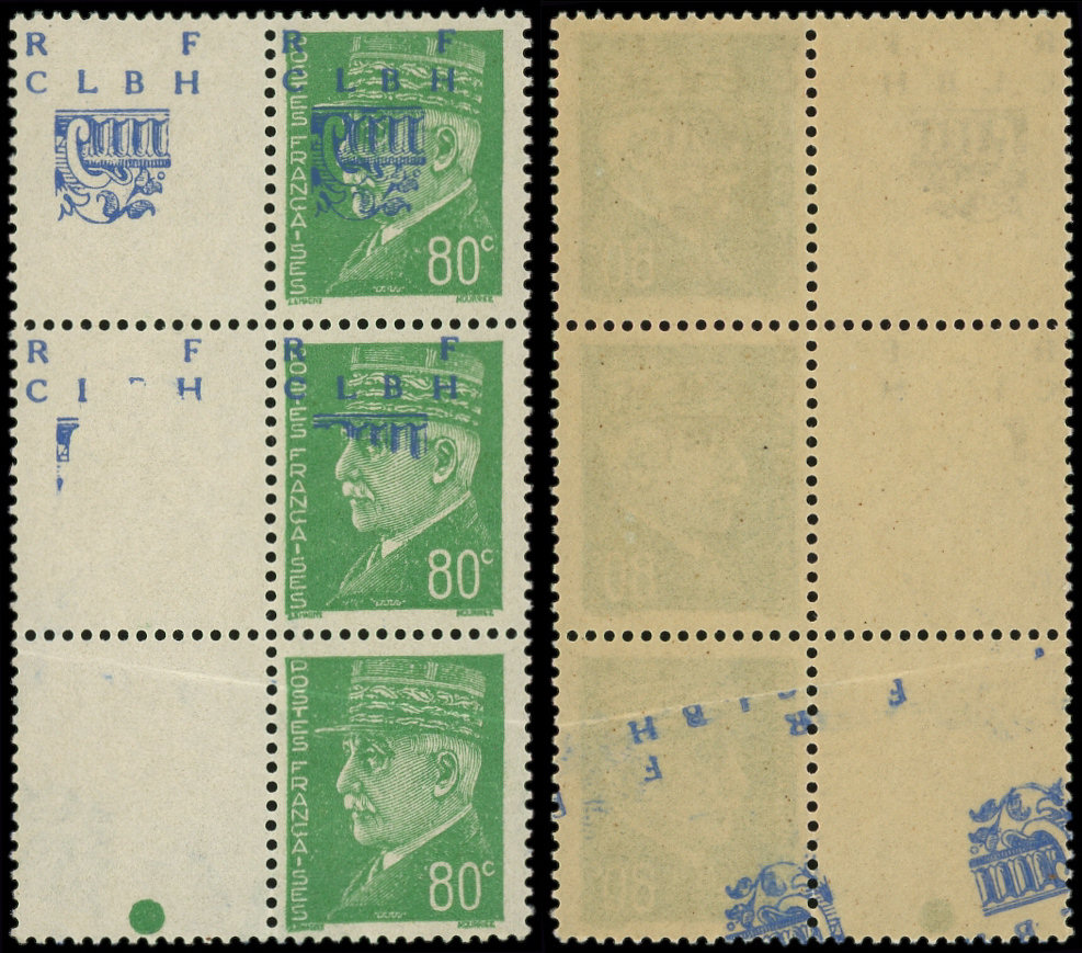 NON EMIS, BANDE verticale de 3 interp., un ex. SANS surch. par PLIAGE (surch. au verso), un ex. surch. PARTIELLE, RRR, TB, signé Mayer (Image)
