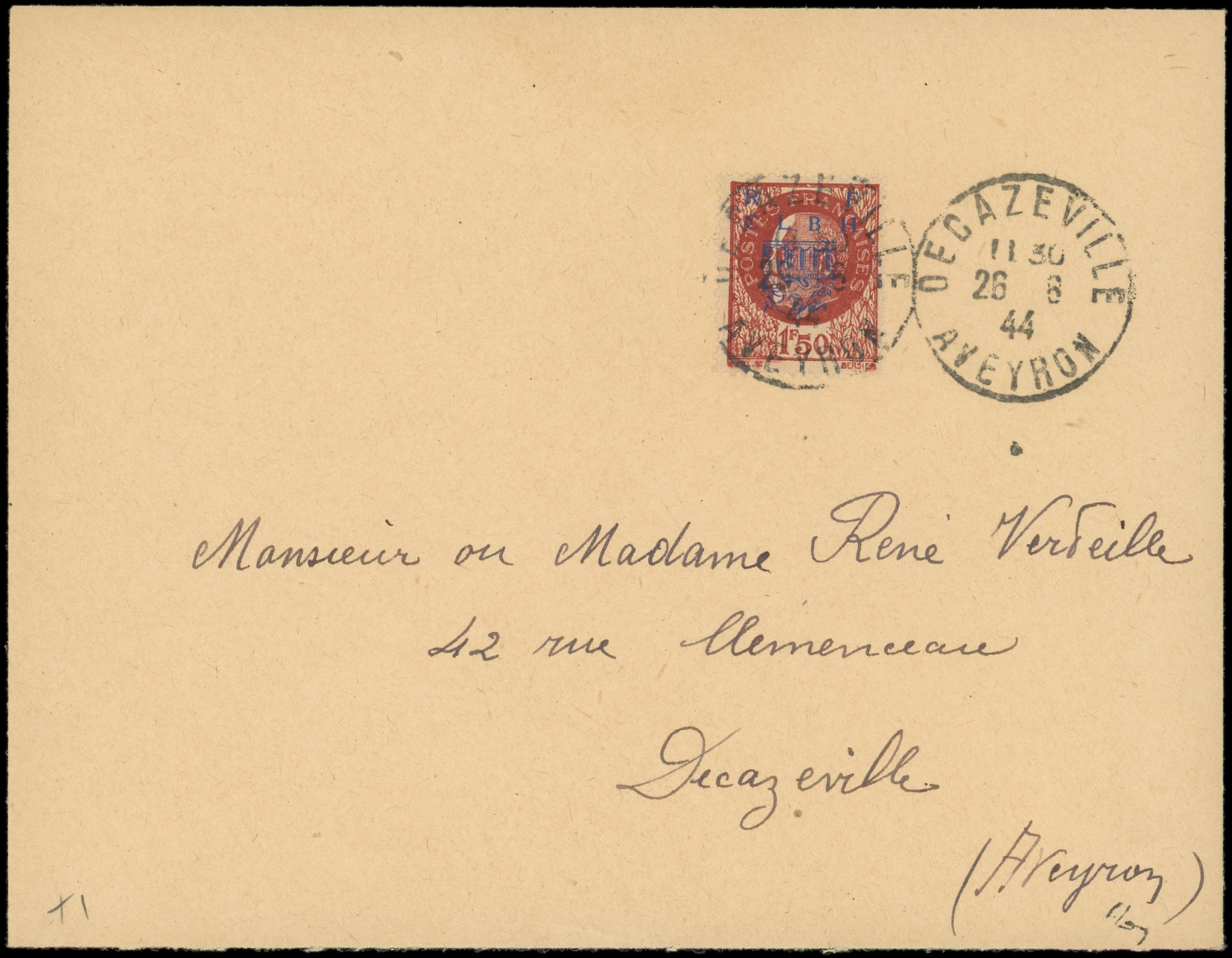 brun-rouge, obl. càd 26/6/44 s. Env., TB (Image)