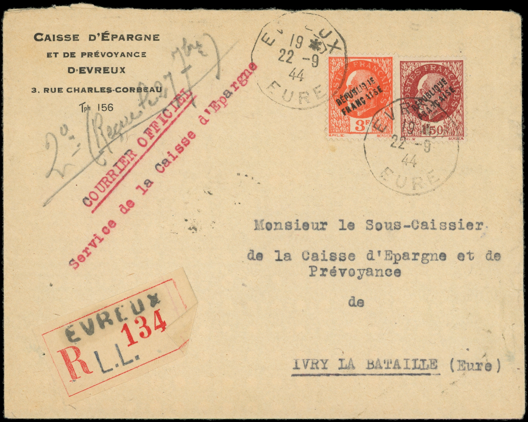 brun-rouge et 3f. orange, obl. EVREUX 22/9/44 s. Env. Rec. de la Caisse d'Epargne, arr. IVRY LA BATAILLE 27/9, TB (Image) (Image2)
