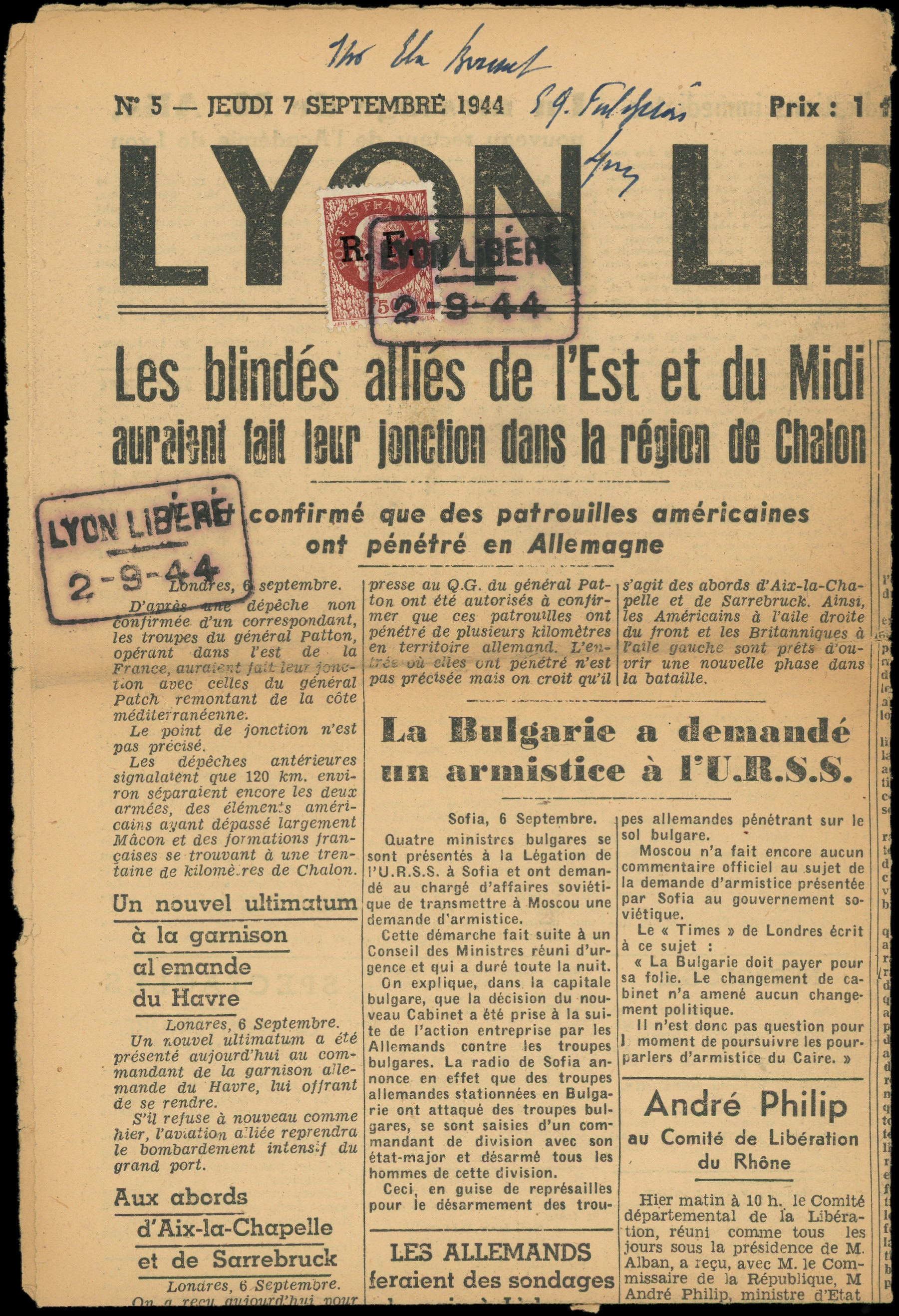 brun-rouge obl. LYON LIBERE/2-9-44 s. Journal du 7/9, TB (Image)