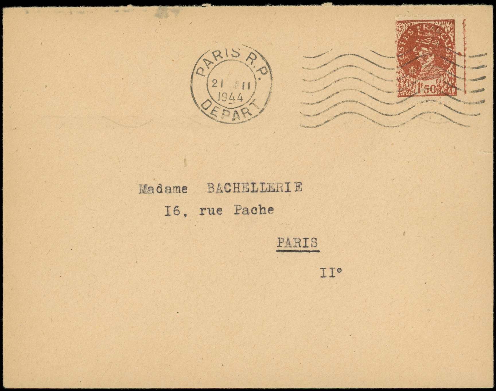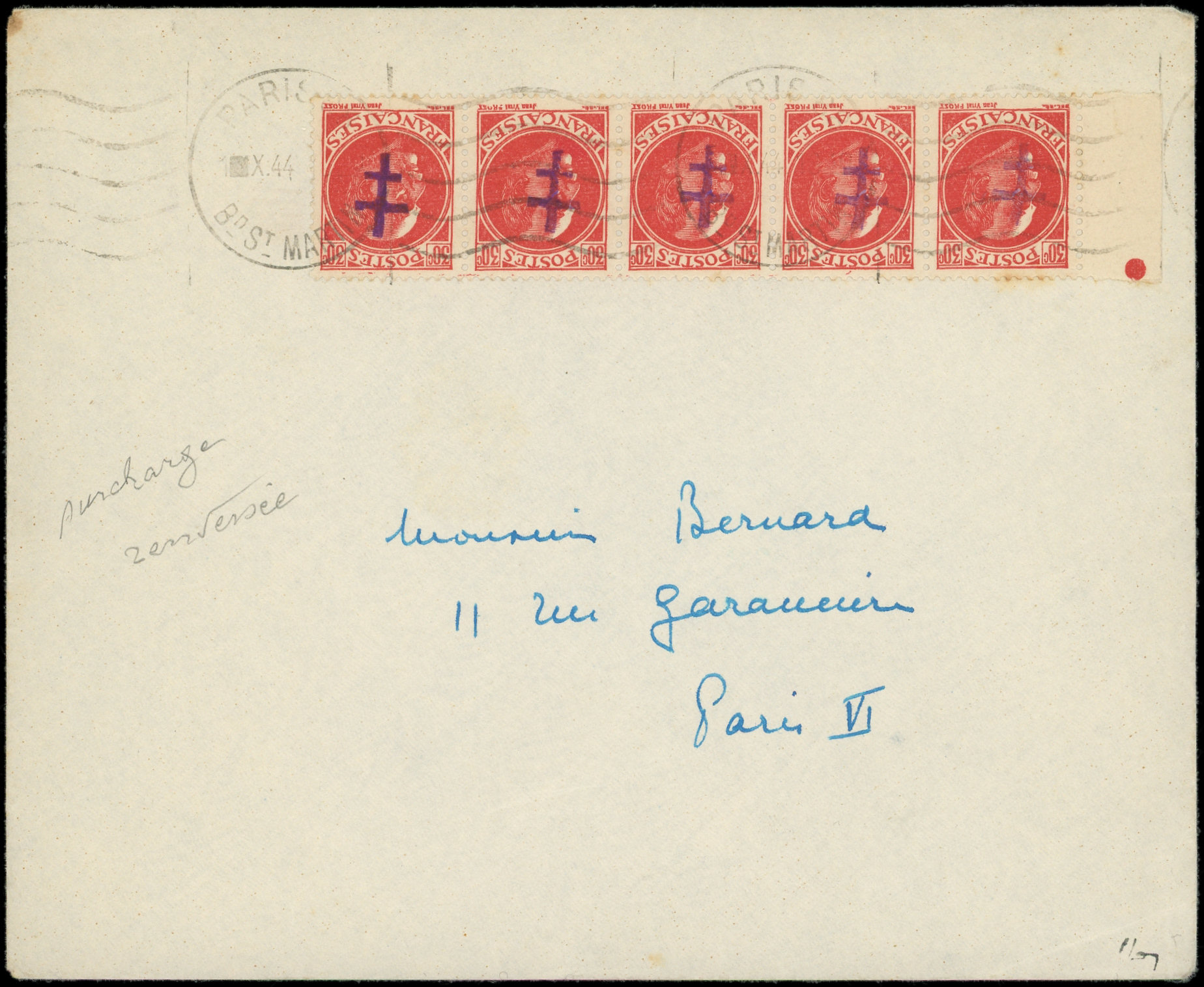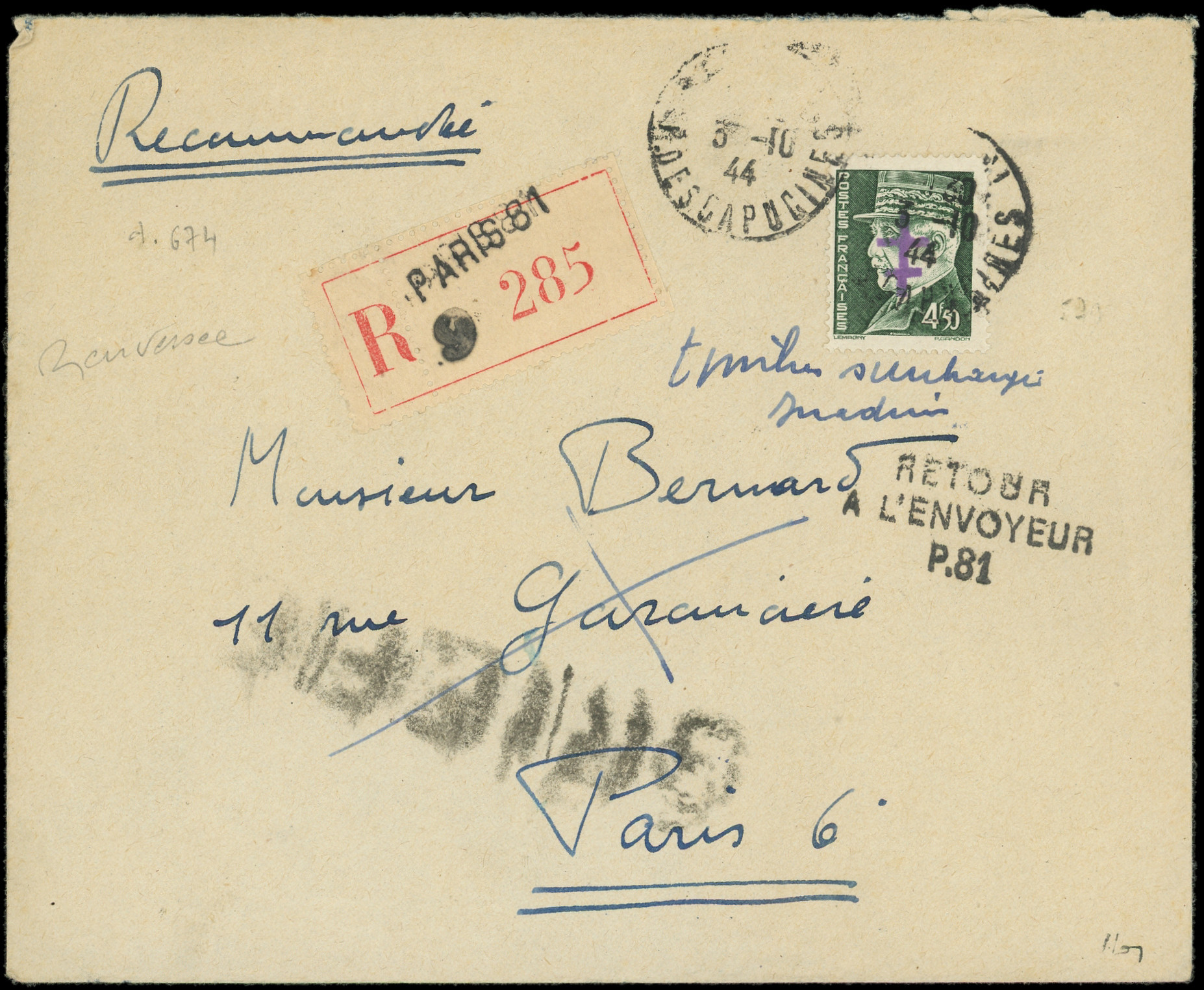 (croix mince) obl. PARIS 81 3/10/44 s. Env. Rec., TB, signé Mayer (Image)