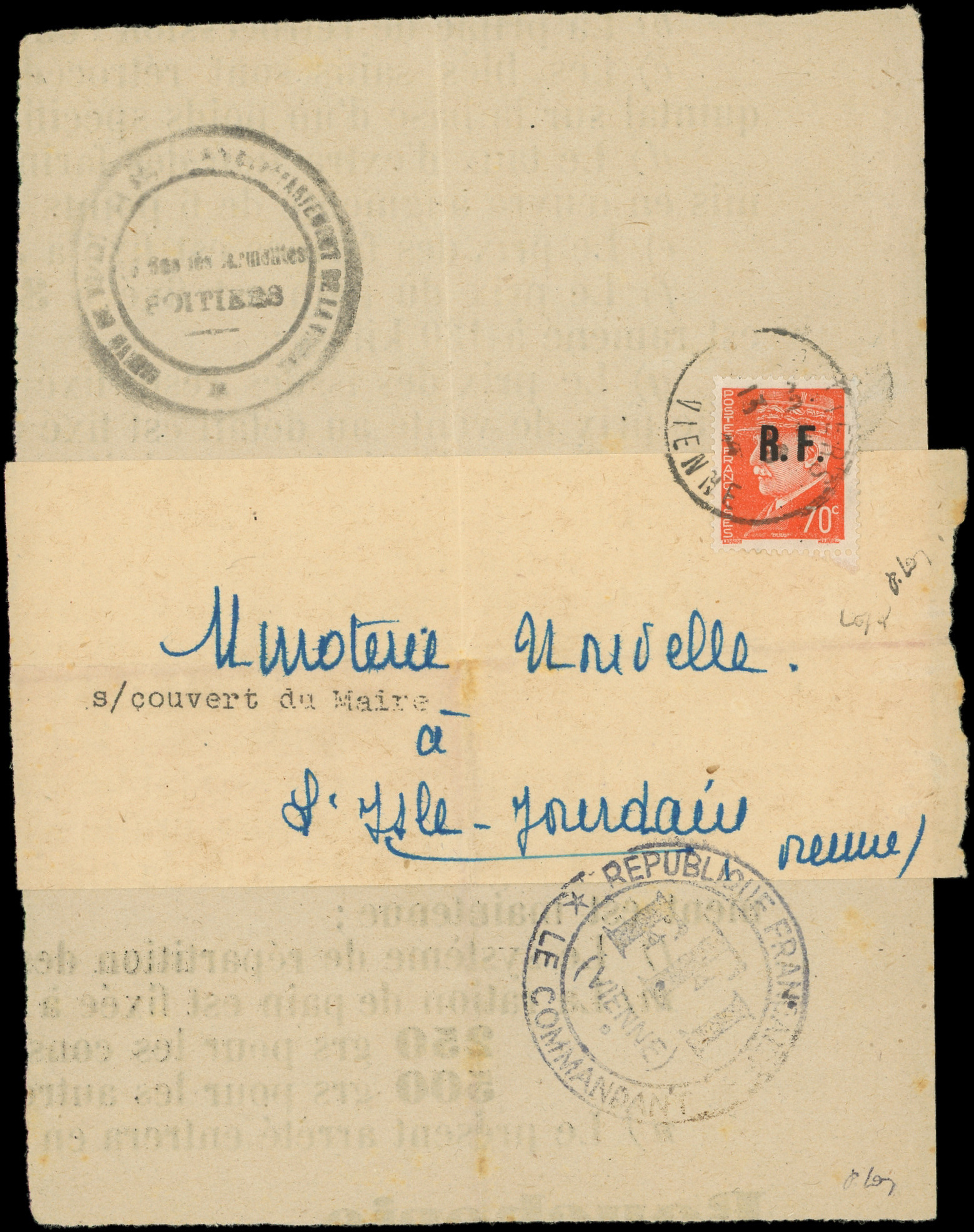 T IV obl. càd sur bande journal adressé "s/couvert du Maire", cachet FFI, R et TB, signé Mayer (Image)