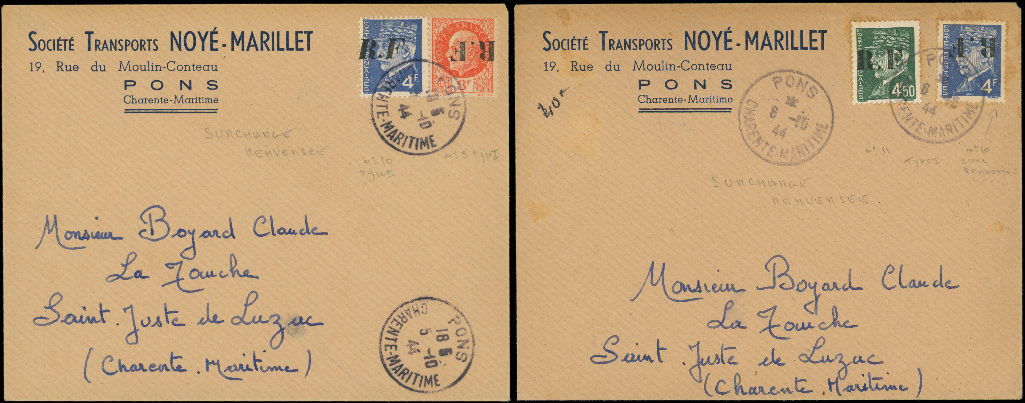 surch. TAXE PERCUE obl. PIRIAC S/MER 24/3/45 s. Env., arr. LA BAULE 26/3, TB, certif. Pickenpack (Image) (Image2)