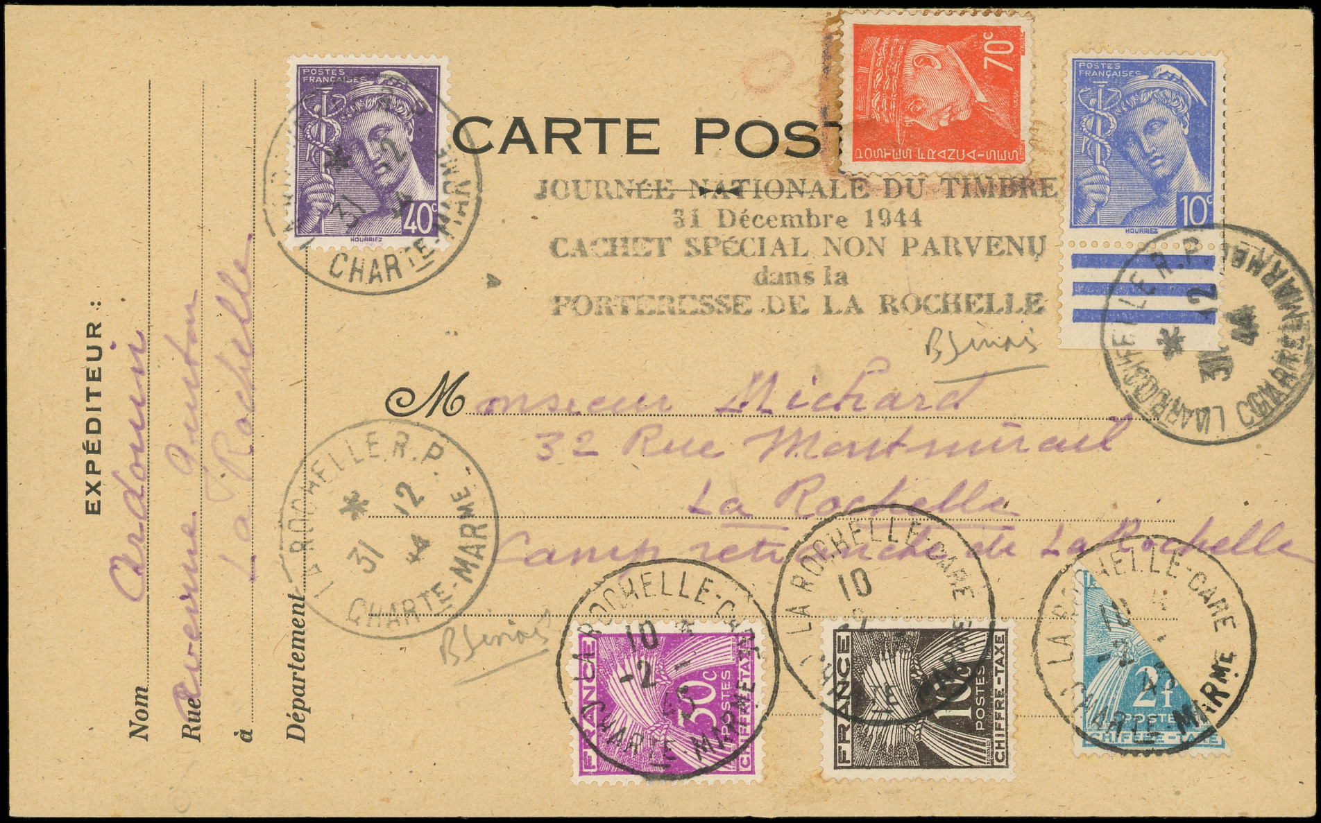 N°546, 548 obl. LA ROCHELLE RP 31/12/44 sur carte taxée à 10c., 30c. et MOITIE de 2f. obl. LA ROCHELLE-GARE 2/(2)/45, griffe "Journée Natale du timbre 31/12/44, cachet spécial non parvenu dans la Forteresse de La Rochelle", RR, TB (Image)