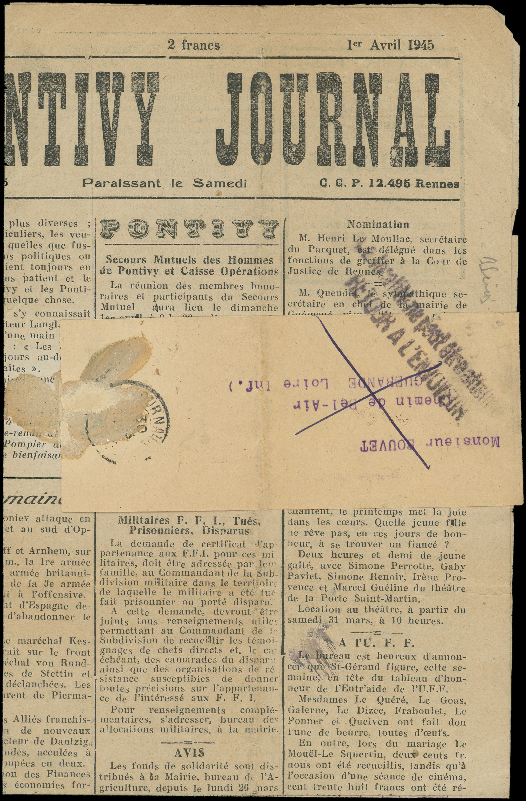 JOURNAL" du 1/4/45, sous bande adressée à Guérande, griffe "La Localité ne peut être atteinte/RETOUR A L'ENVOYEUR", TB (Image)