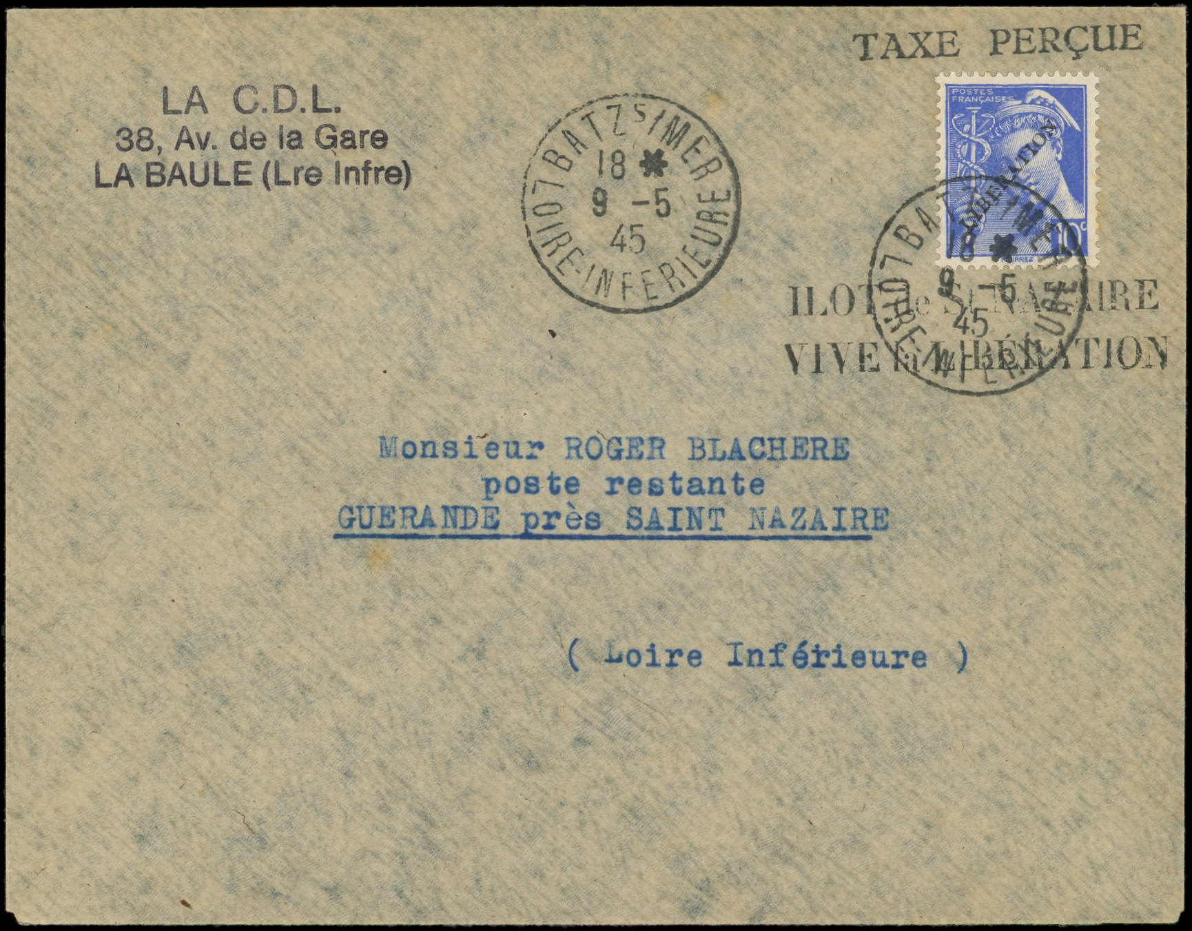 LIBERATION obl. BATZ S/MER 9/5/45 s. Env., griffe "TAXE PERCUE", arr. Guérande 11/5, TB (Image)