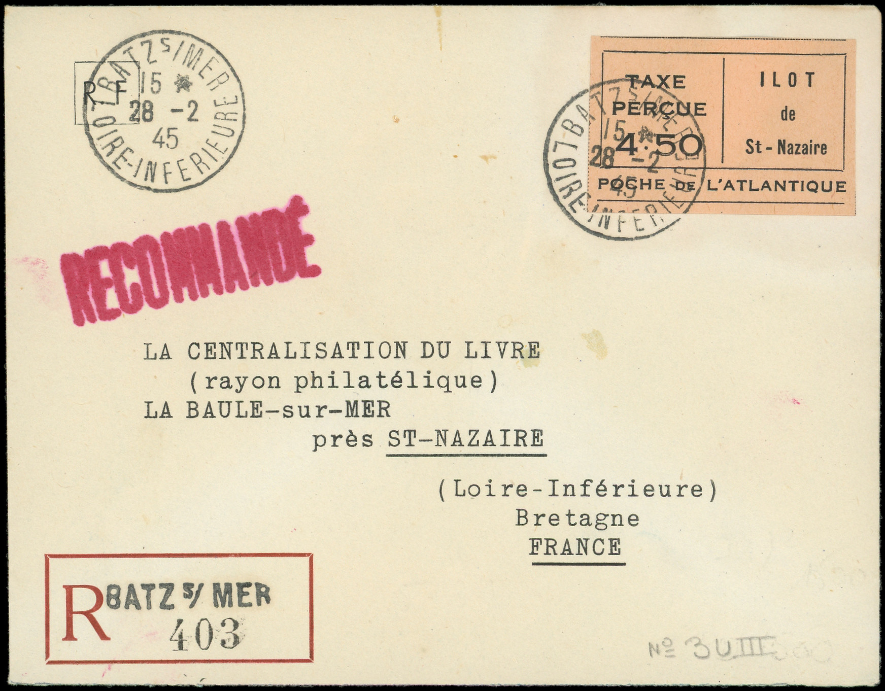 Perçue 4f50 noir s. saumon format réduit sans POCHE DE L'ATLANTIQUE obl. Batz-s-Mer 28/2/45 s. Env. Rec., arr. La Baule 1/3, TB (Image) (Image2)
