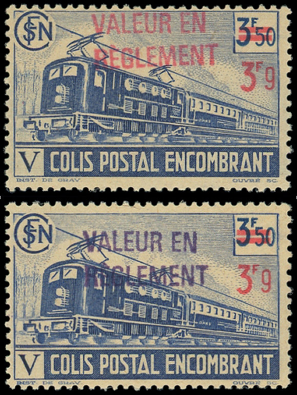 3f50 bleu, 2 ex. surchargés VALEUR EN REGLEMENT en bleu et en rouge, TB (Image)