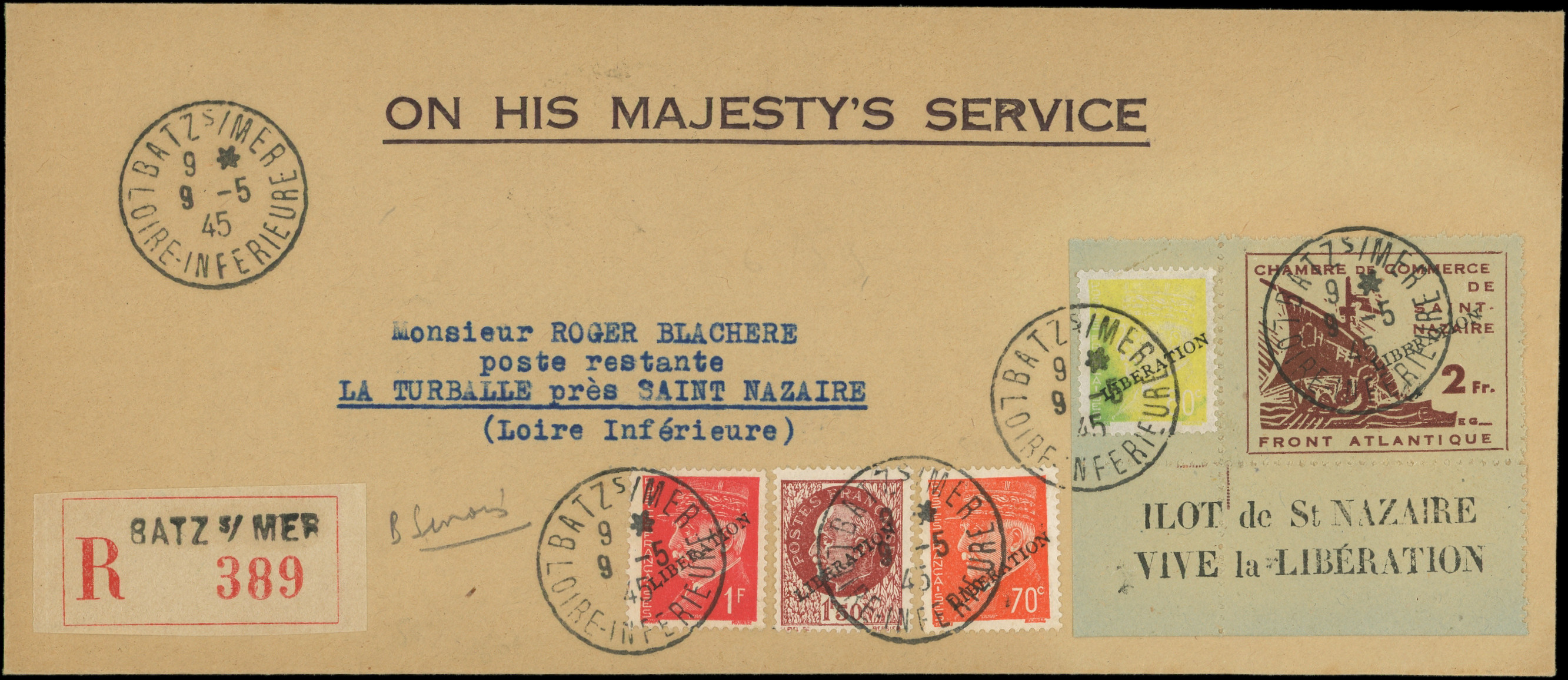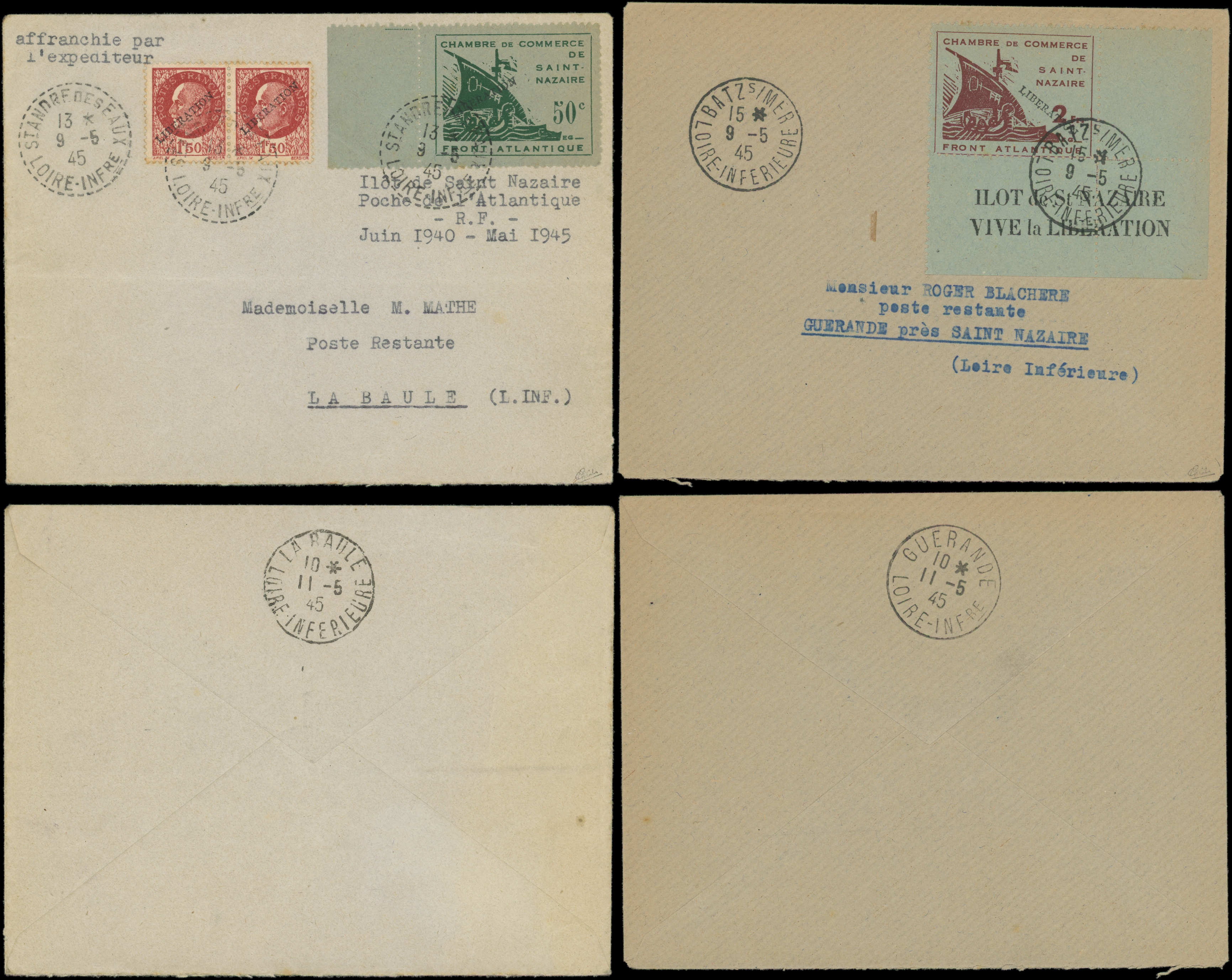 Poste N°517 PAIRE et N°9 cdf, tous surch. LIBERATION obl. ST ANDRE DES EAUX et BATZ S/MER 9/5/45 s. 2 Env. avec arrivées, TB. C (Image)