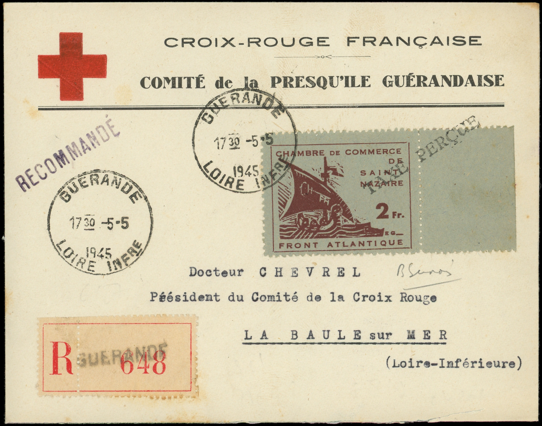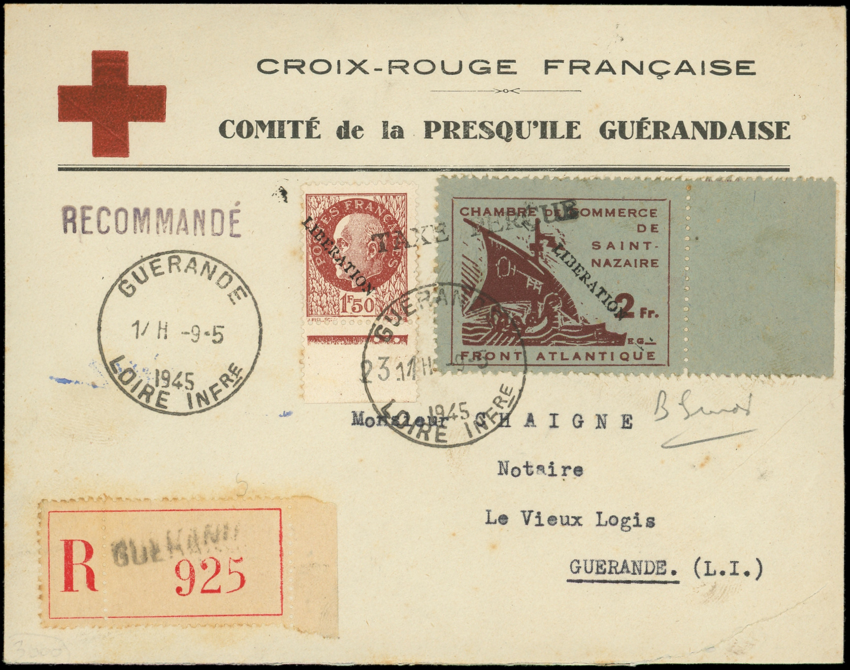 vert, bdf, surch. TAXE PERCUE obl. GUERANDE 5/5/45 s. Env. de la Croix Rouge, arr. LA BAULE 7/5, R et TB (Image)