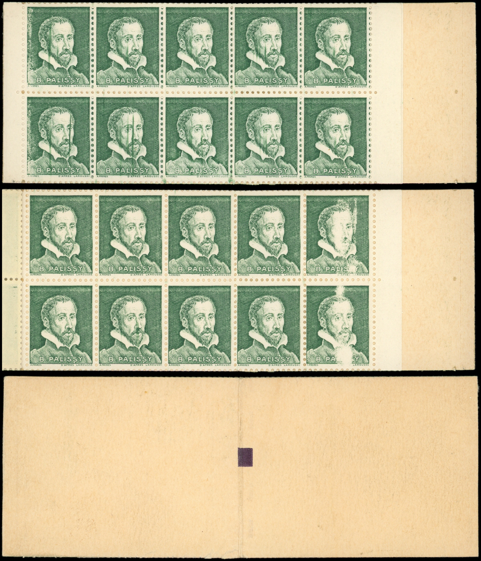 vert-jaune, carnet de 20 ouvert, couv. vierge, 8 ex. défaut d'essuyage, 2 ex. imp. défectueuse, R, TB (Image)