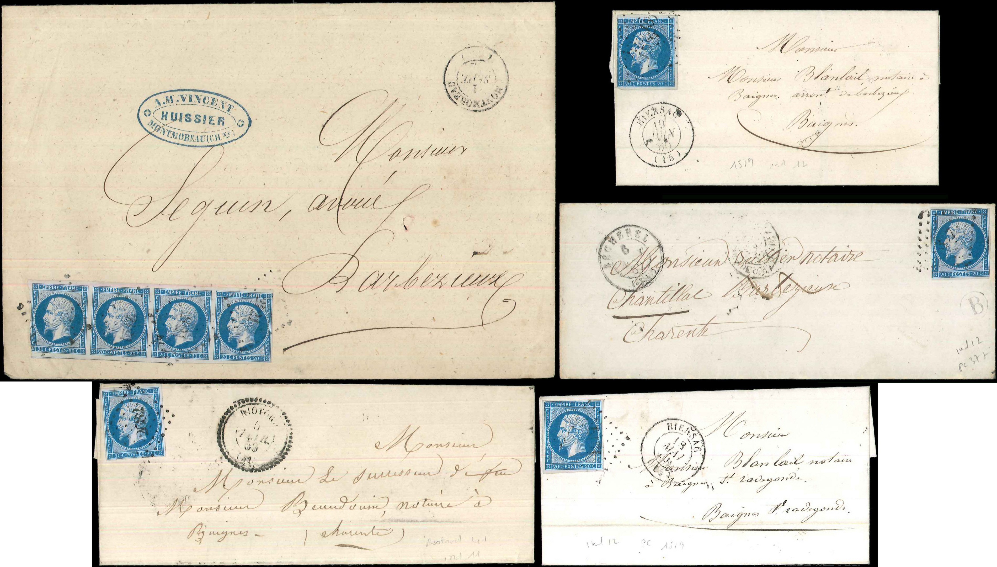 I, 4 unités et une BANDE de 4, oblitérations diverses sur 5 Lettres, TB (Image)