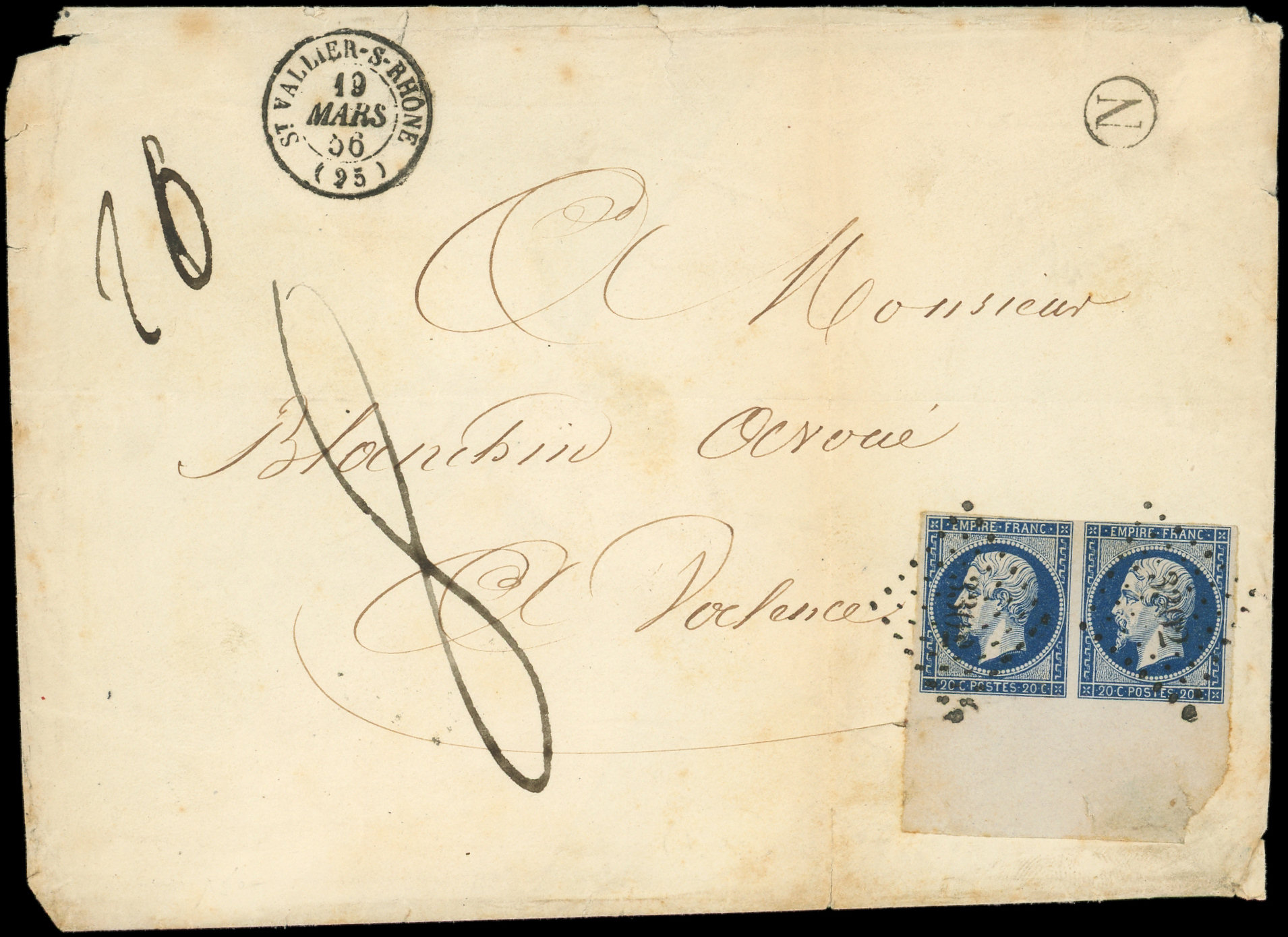 foncé, T I, PAIRE bdf obl. PC 3302 s. Env., càd T15 St VALLIER-S-RHONE 19/3/56 et Boite N, poids 26 et Taxe 8 plume, TB (Image)