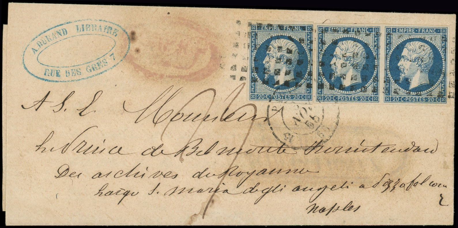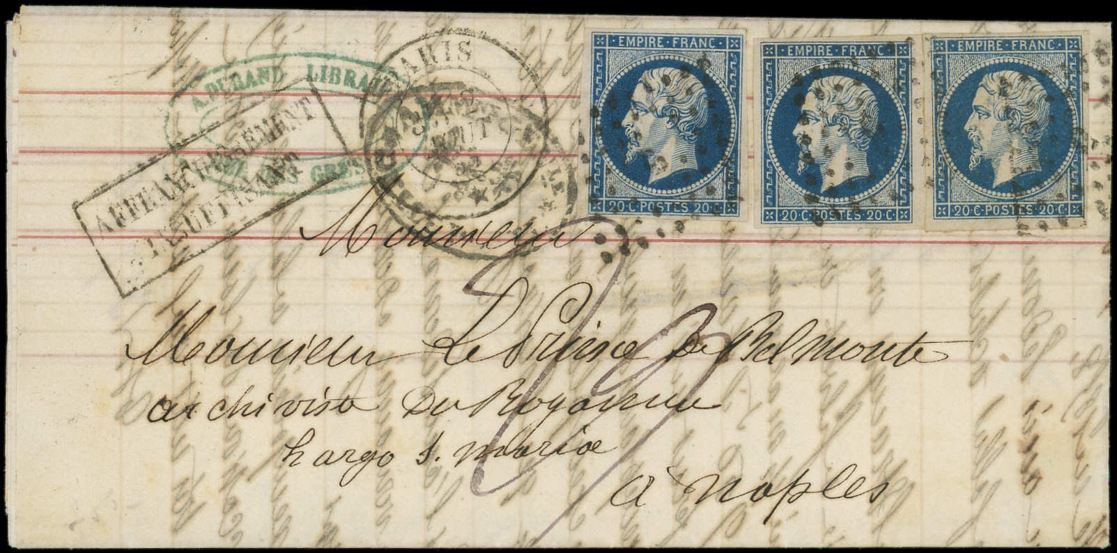 foncé, T I, 3 ex. obl. Losange s. LAC de Paris 1/8/57, "affrt insuff" et TAXE Plume pour NAPLES, TB (Image)