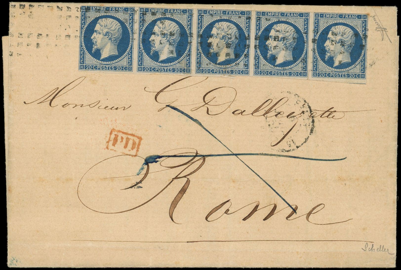 foncé, T I, BANDE de 5, 1er t. touché, les 4 autres le long du filet en haut, obl. GROS POINTS s. LAC de Paris 6/7/55, arr. ROMA 12/7, affrt peu courant et très plaisant, S