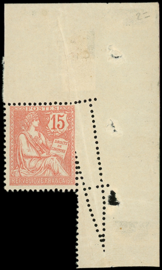 Retouché, 15c. vermillon, cdf, piquage OBLIQUE, TB (Image)